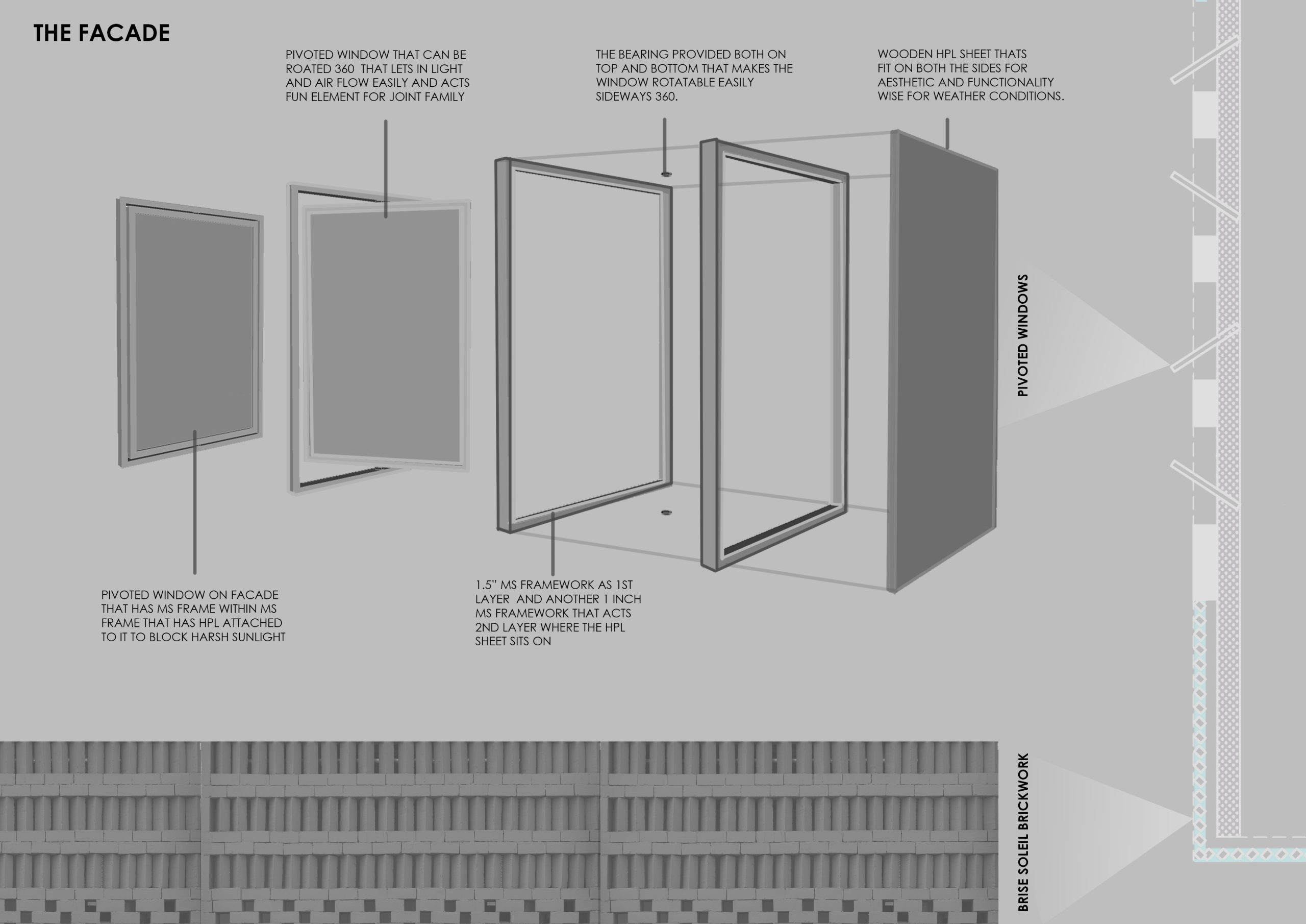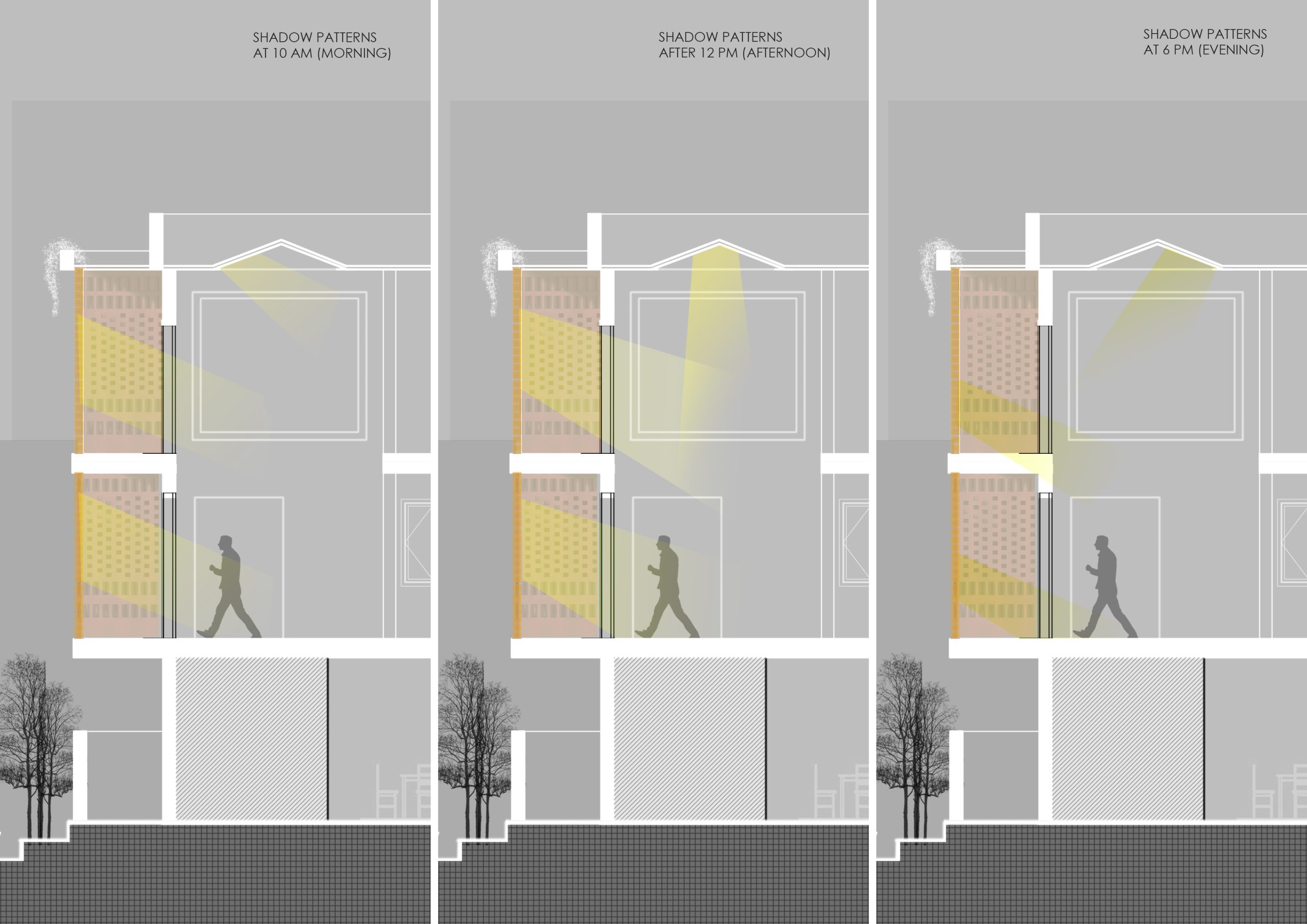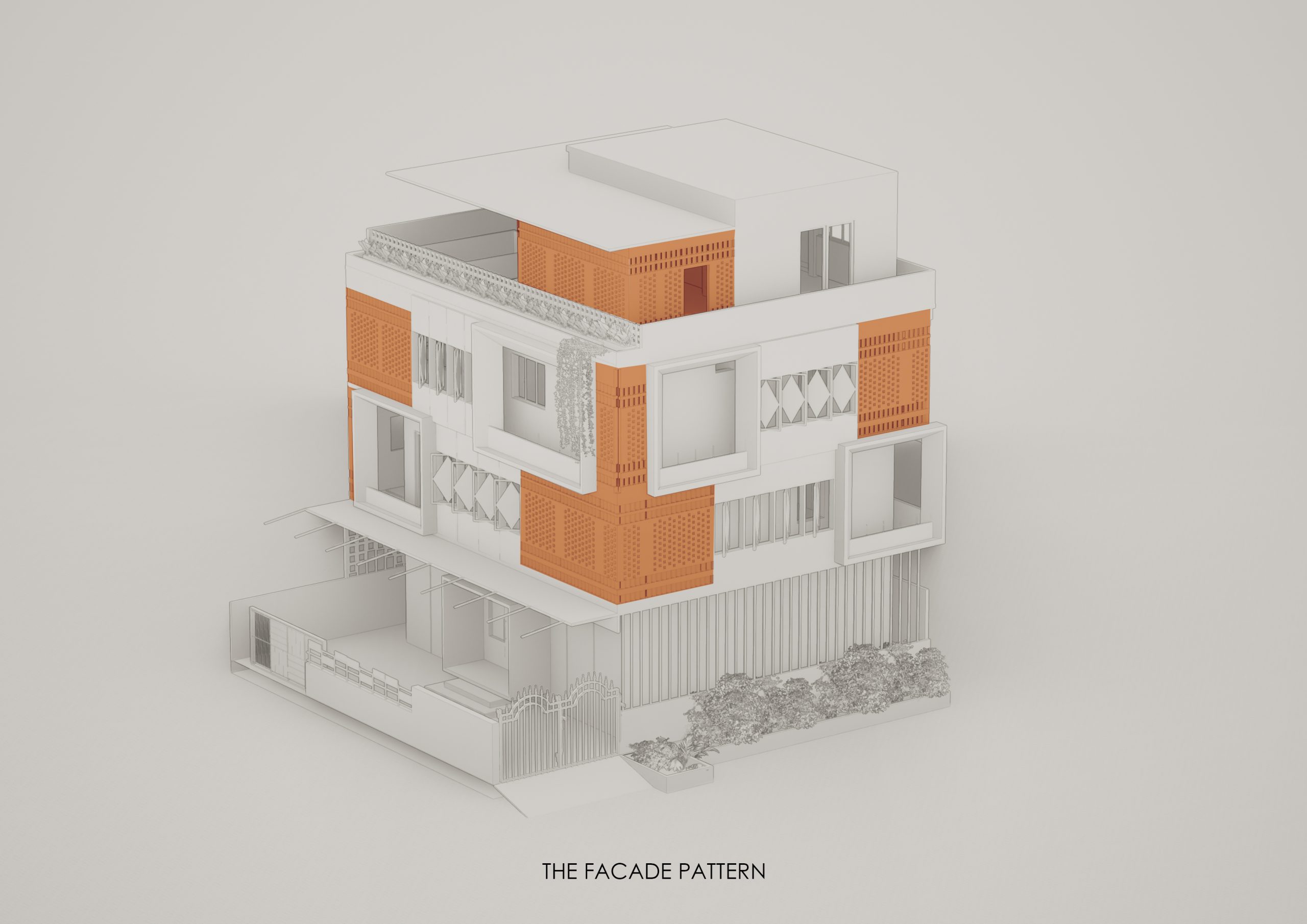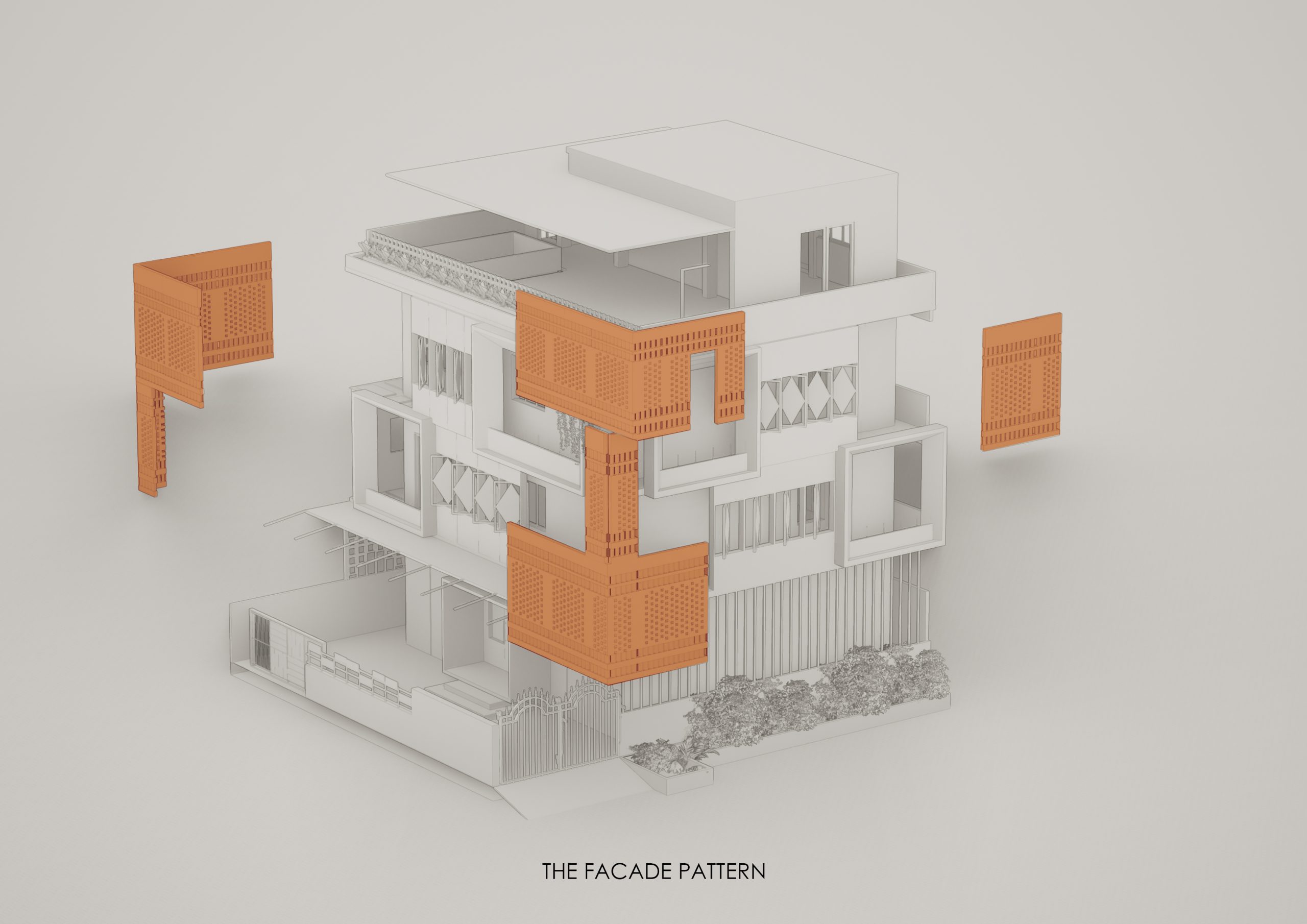 سنگ تراش های محلی با استفاده از آجرهای محلی برای دیوار الگو، الگوهای متعددی را آزمایش کردند. این دیوار نه تنها زیبایی را به ارتفاع می افزاید، بلکه الگوهای سایه جالبی را در داخل ایجاد می کند تا اعضای جوانتر خانواده را مجذوب خود کند. فضاهای داخلی از آفتاب فیلتر شده و تهویه بهتر به لطف غربالگری دوگانه که توسط هر یک از دیوارهای راهرو امکان پذیر شده است، بهره می برند. پنجره های محوری به طور متفکرانه در مقابل قسمت های خصوصی مانند اتاق خواب قرار گرفته اند و سرویس های بهداشتی روزنه های دیوار الگوی آجری بیرونی را در بر می گیرند. قابلیت بستن کامل این پنجره ها در صورت نیاز برای اطمینان از حداکثر حریم خصوصی نیز انعطاف پذیری استفاده از آن را بر اساس زاویه نور خورشید افزایش می دهد.