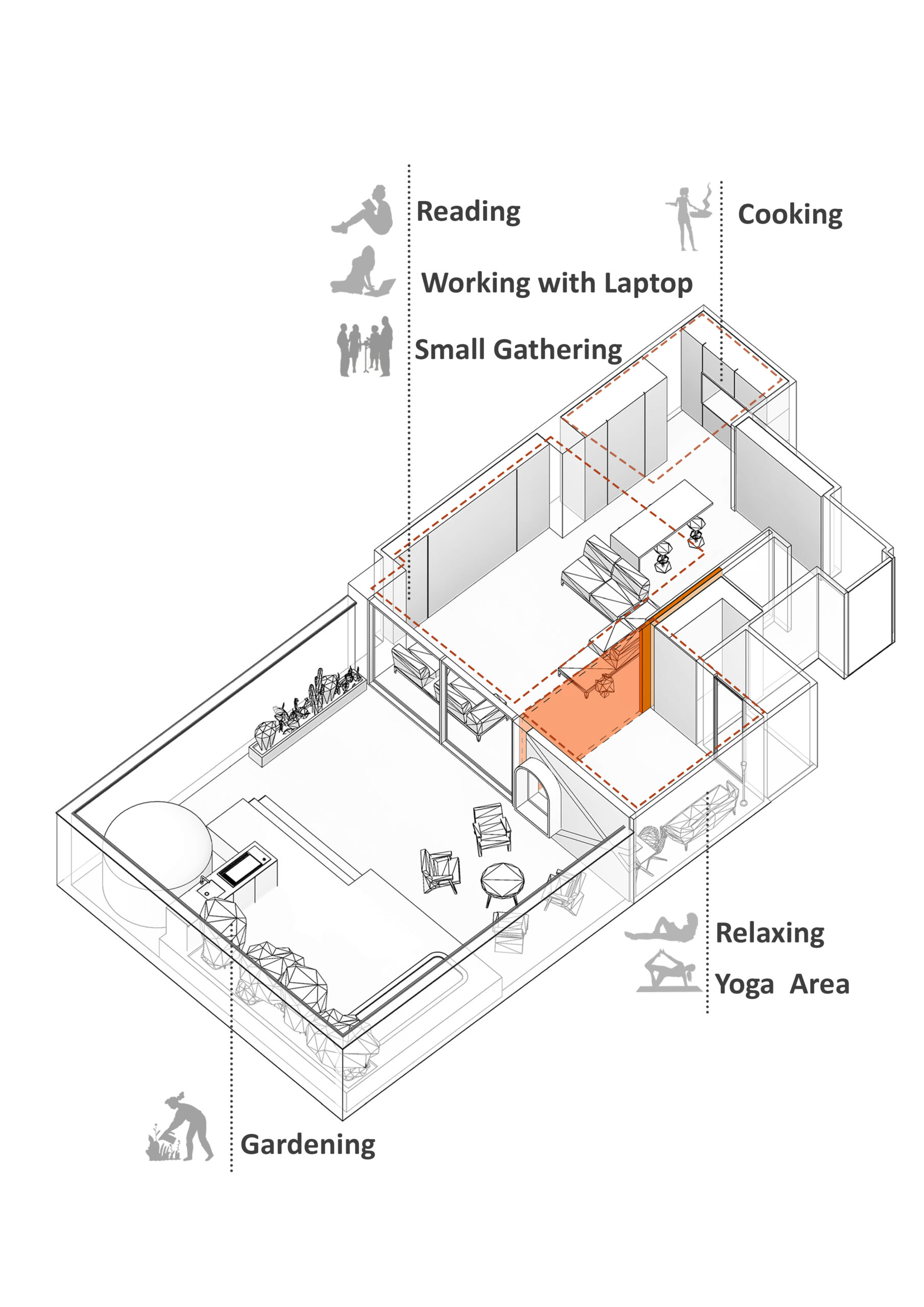 جانمایی فضاهای داخلی به گونه ای انجام شده است که امکان ایجاد فضایی یکپارچه فراهم شود. طراحی اتاق خواب به شکلی انجام شده که در عین حفظ کارکرد اصلی اش، امکان استفاده به عنوان فضای سالن را هم داشته باشد. ارتباط میان آشپزخانه و سالن اصلی بدون هیچ واسطه ای در نظر گرفته شده و این گونه امکان گشایش بین فضای داخل و خارج به وجود آمده است.