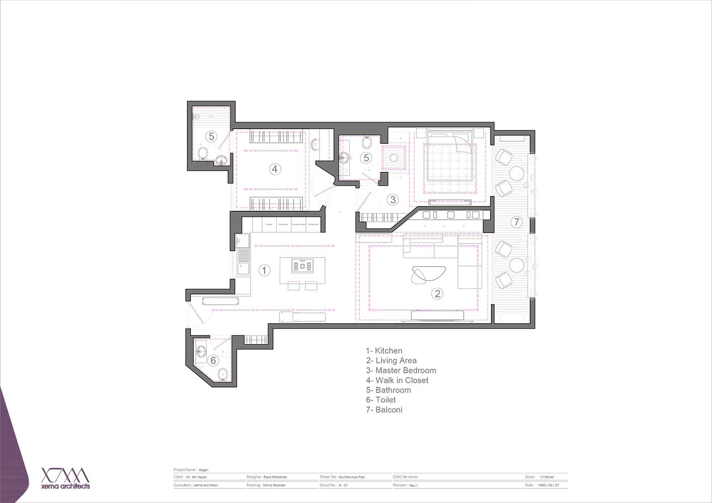 اتاق مستر، ابعاد مناسب تری پیدا کرد، سرویس اتاق مستر با این تغییرات ابعادی به گونه ای طراحی شد که ارتباط موثرتری با اتاق خواب داشته باشد. بخش دوش به فرم یک مکعب شفاف شیشه ای از محدوده سرویس جدا و به سمت سرویس خواب کشیده شد. اتاق مهمان به صورت دو منظوره و شامل اتاق خواب و اتاق لباس در نظر گرفته شده است.