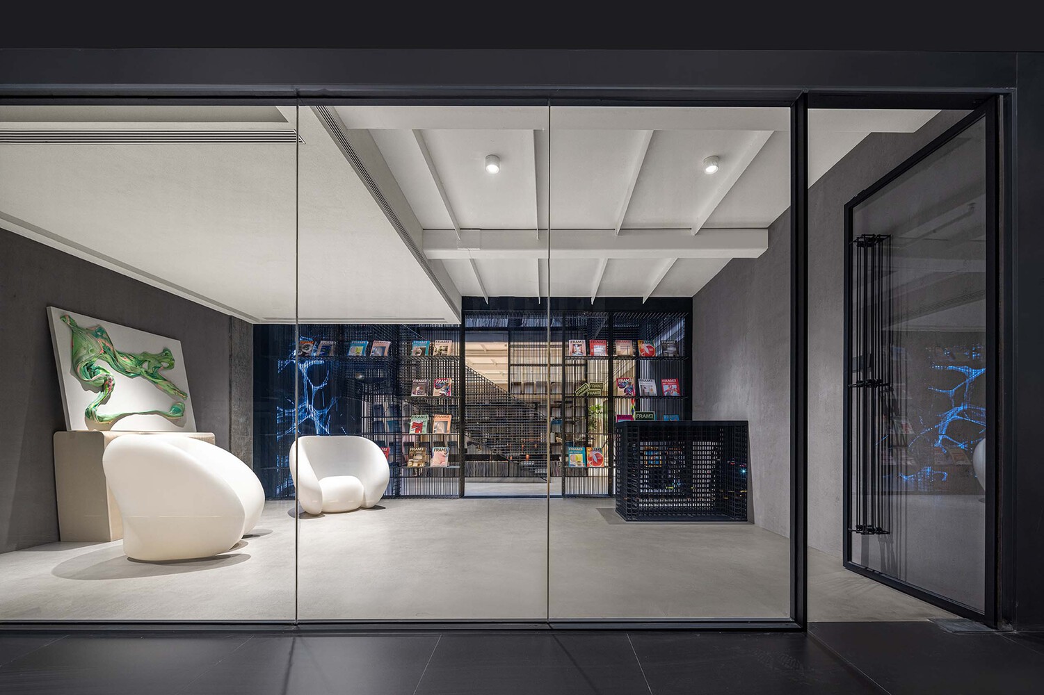 قفسه های کتاب و پله های اطراف دهلیز به کانون بصری دفتر تبدیل می شوند. قفسه های کتاب برای نگهداری مجلات و مطالب تیم تحریریه استفاده می شود، در حالی که راه پله نقش کلیدی به عنوان گردش عمودی در فضا دارد. این دو با هم یک اینستالیشن به ارتفاع ۸.۸ متر را با موضوع «FRAME» تشکیل می دهند. قفسه ها و پله ها از میله های فولادی تقویت کننده با قطر ۸ میلی متر بافته شده اند و این “قاب” شفاف حضور فیزیکی سازه ها و رابط ها را تضعیف می کند.