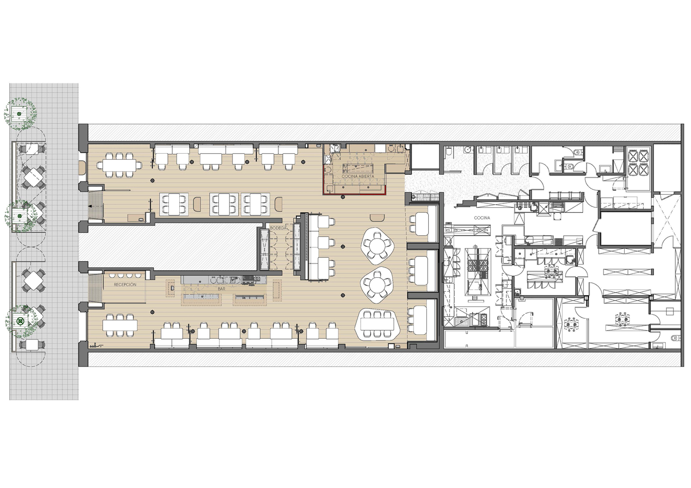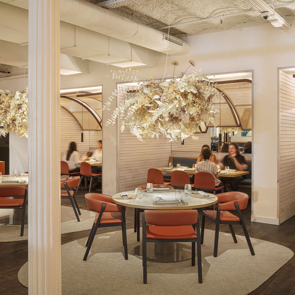 تمام مواد و محصولات مورد استفاده در این پروژه ۱۰۰% محلی هستند، همراه با هنرمندان و صنعتگرانی که با آنها برای ایجاد قطعات سفارشی برای رستوران همکاری شده است. این رستوران در یک مکان کلاسیک در منطقه Eixample بارسلونا، با ساختار فولادی تماشایی است. یکی از آن فضاهایی که در آن می توان یک گالری هنری را تصور کرد که در این محله بسیار رایج است. و به این ترتیب است که ما طرح را تصور کرده‌ ایم: یک فضای سفید گسترده که توسط سه “پنجره” آبی انتزاعی به سمت دریای مدیترانه هدایت می‌ شود: یک پنجره مجسمه‌ سازی، تصویری و یک پنجره پارچه‌ ای. این “پنجره ها” به صورت سفارشی طراحی و با همکاری هنرمندان و صنعتگران محلی ساخته شده اند.