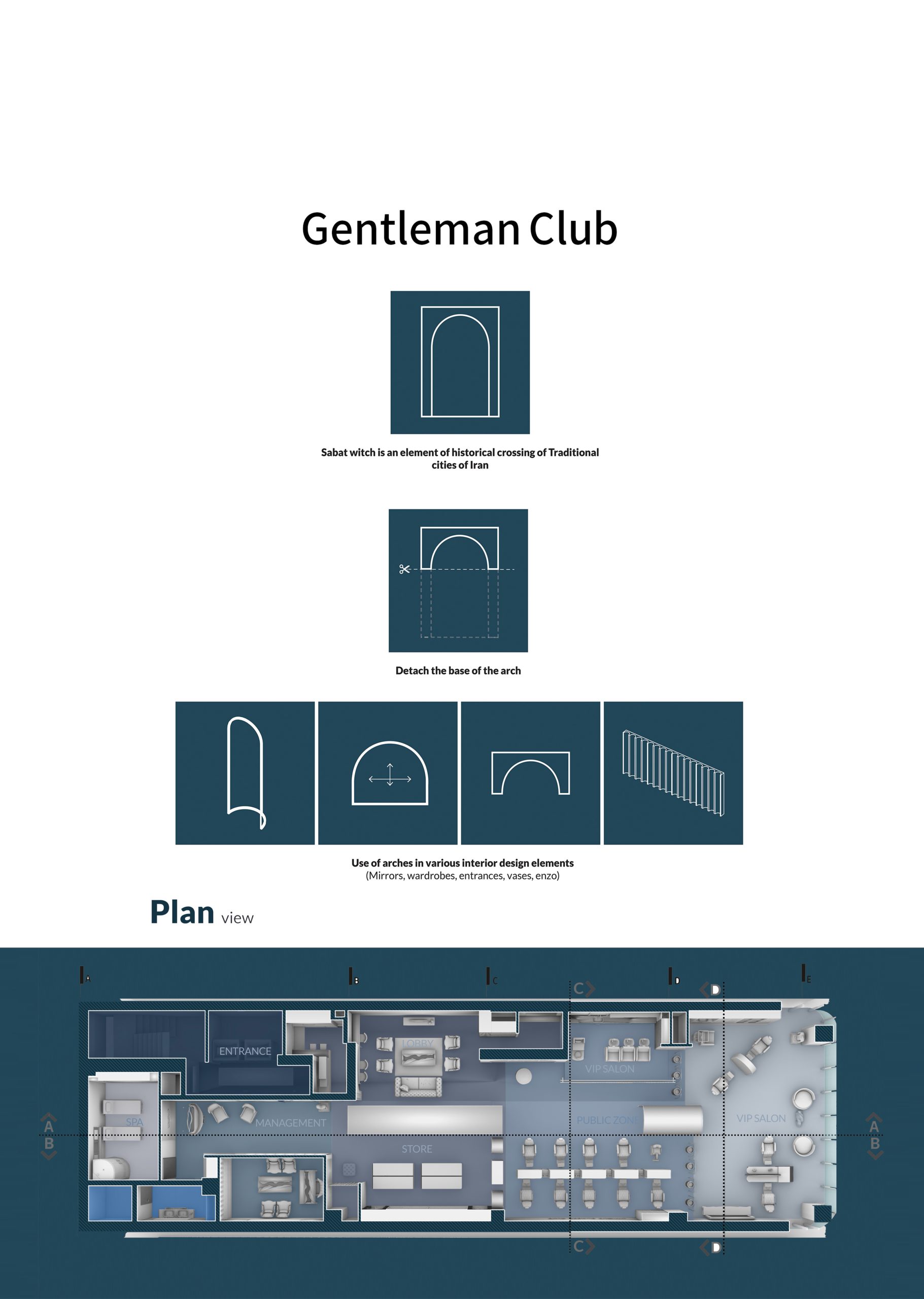 نیاز به وجود فضایی اختصاصی برای آقایان جهت ریلکس و ریکاوری خستگی ناشی از کار روزانه پیشنهاد مطلوب تیم طراحی برای ایجاد یک فضا، با تمامی خدمات منحصر مردانه شده است. طراحی یک کلوپ مختص آقایان نیاز به فضایی یکپارچه در نقطه ای از باکیفیت ترین محلات شهری بود از این رو با هم فکری کارفرما یک سالن به مساحت ۴۰۰ مترمربع، در منطقه تجاری لوکس مشهد درطبقه چهارم از یک مجتمع نوساز تجاری اجاره گردید در ابتدا یک بررسی دقیق از نیازهای مشتریان توسط تیم طراحی جمع آوری شده است. سپس برخی از نکات دیگر را مستقیماً از پرسنل مجموعه دریافت کرده اند این بررسی ها نشان داده که در کنار راحتی مشتریان راحتی نیروهای کاری مجموعه نیز به همان اندازه مهم است. سپس با تهیه جداول برنامه دهی از نیازها و تحلیل و بررسی آن منجر به رسیدن پاسخ های معمارانه در بخش های اقتصادی -عملکردی- خدماتی- بهره برداری و زیبایی شده است.