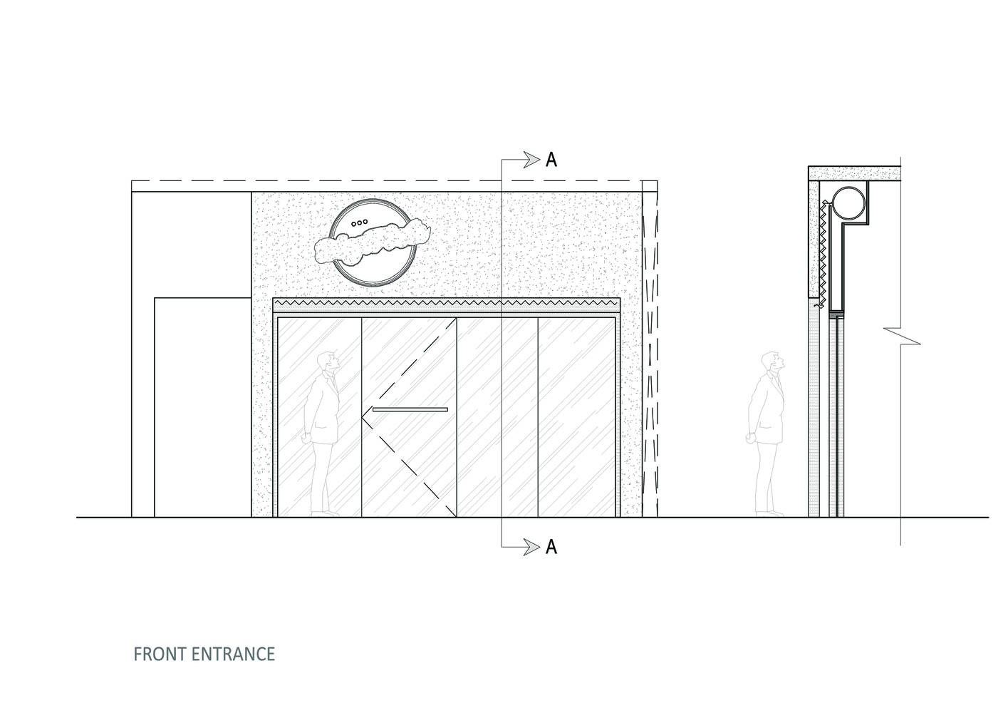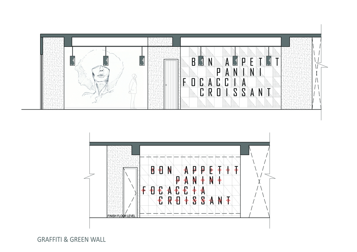 استفاده از گرافیتی فریبنده و برجسته در ورودی، که روحی آرام را به تصویر کشیده است، گویی در ترکیب عناصر باقی مانده که بی سر و صدا از آن حمایت می کنند، لنگر انداخته است. در این تصویر با رنگ های آبی روشن، آب به تصویر کشیده شده است که عنصر حیات و بازسازی است. این طراحی به طور آنی، آغاز آرامش به صورت بصری در فضای داخلی را از محیط شهری خارج، با القای تسکین از طریق رنگ بر خلق و خوی مخاطب ایجاد می کند.