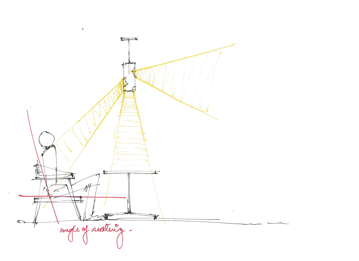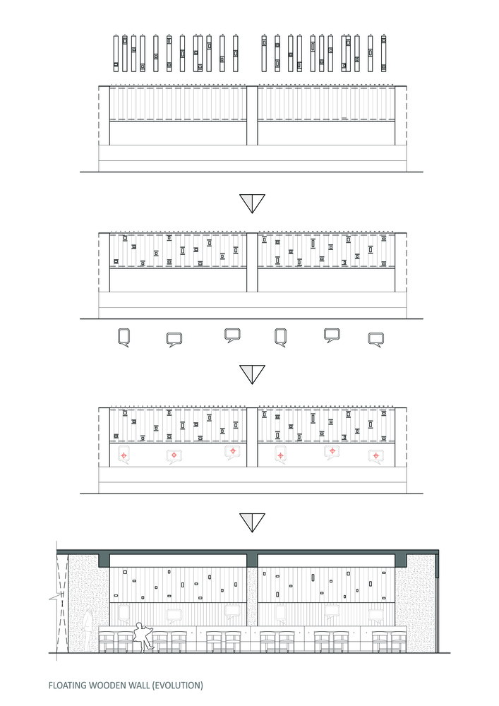 صفحات چوبی معلق در هوا با طاقچه های نورانی، بدون تماس با زمین، مسیر وزش باد را به تصویر می کشد که قبل از عبور در شاخه های درخت گیر می کند و هنگام نشستن زیر آن درخت دیالوگ هایی رد و بدل می شود. بزرگترین وسعتی که برای ترسیم آن برای آن تعیین شده است، فراتر از دسترسی فیزیکی شروع می شود و به پایان می رسد. این عنصر نقش محوری ایفا می کند زیرا قرار است به صورت پویا و ناخودآگاه فرد را از یک سر به انتهای دیگر کف صندلی حمل کند.