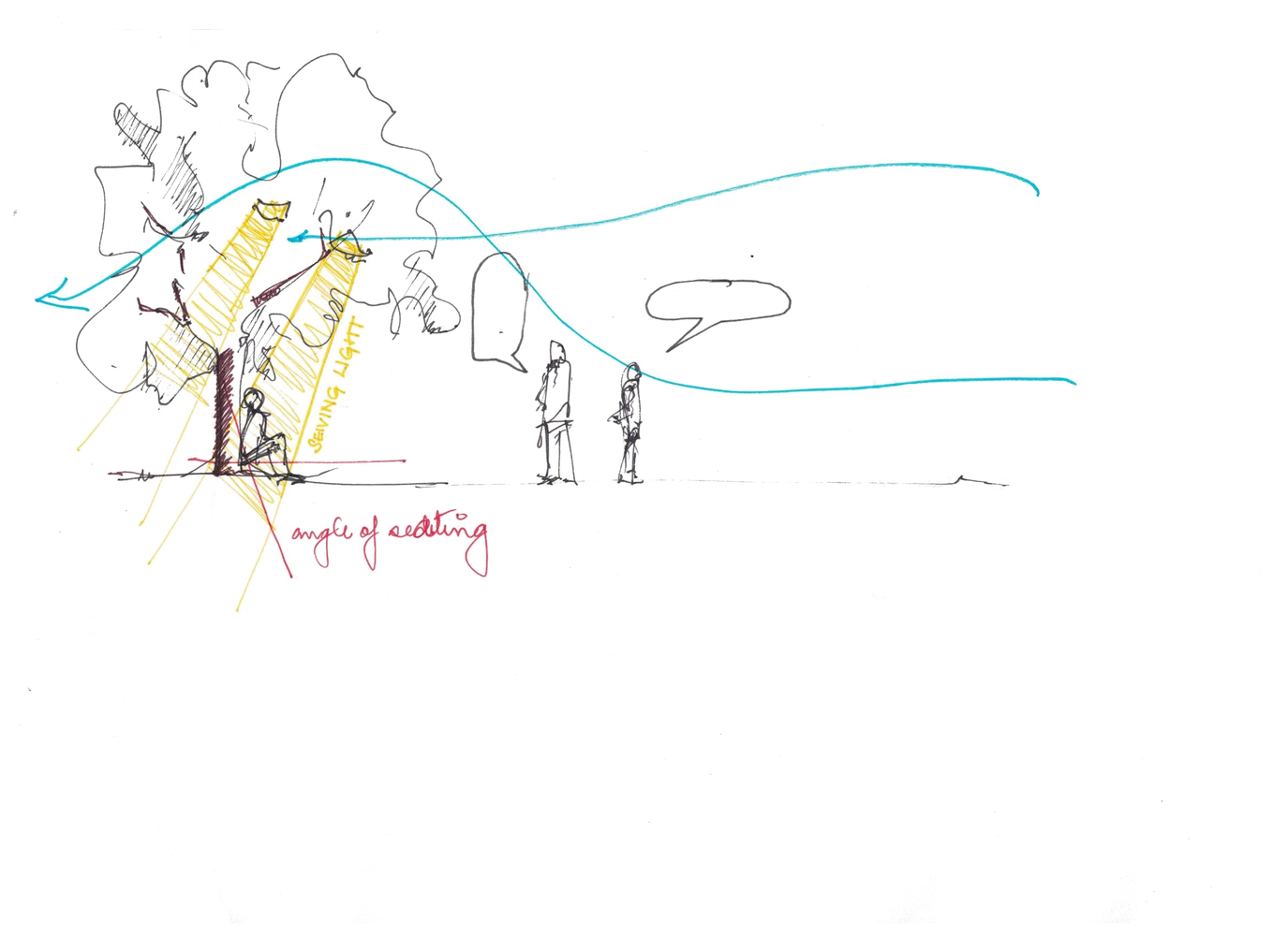 مردمی که زیر درختی با شکوفه کامل نشسته اند، که در آن برگ ها در باد خش خش می کنند، و نور از لابه لای شاخ و برگ ها الک میشود تا فضاهایی آفتاب گیر در اطراف ایجاد کند، تا گفتگوی دوستانه ای را در اطراف تقویت کند.»