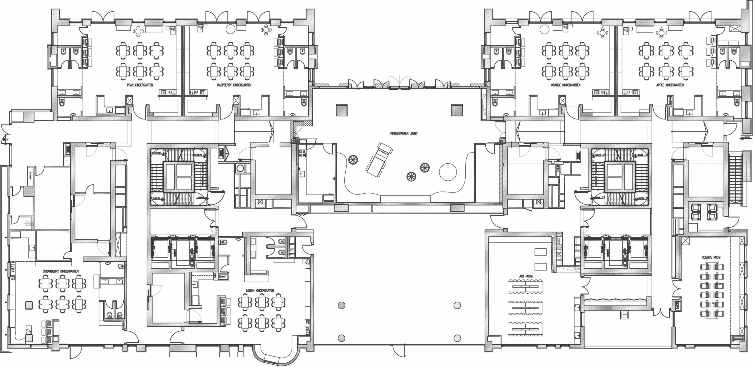 یک پرتقال بزرگ که در مرکز قرار دارد، بازی تعاملی را تشویق می کند. در سرتاسر راهروی مهدکودک، خانه‌های بازی چوبی رنگارنگ مختلف، بچه‌ها را به بازی و کاوش دعوت می‌کنند. طراحی فضا هم نیازهای آموزشی و هم میل به ترویج یک محیط بازی دوستانه را در نظر گرفته که فعالیت عملی و تجربه ای ماندگار را ارائه می دهد.