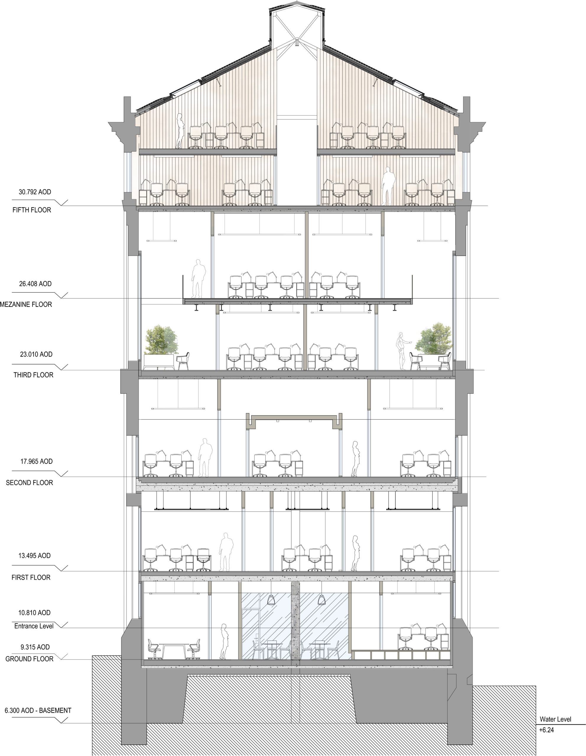 به منظور تجسم مجدد فضا برای استفاده مدرن، عناصر داخلی جدید با حساسیت به ساختمان اضافه شده است و در عین حال ساختار اصلی ساختمان را بدون آسیب باقی می گذارد. در طبقه پنجم، سازه های غلاف بین خرپاهای موجود برای به حداکثر رساندن حجم و ایجاد فضاهای اداری نیم طبقه با پنجره های روزنه ای بزرگ که چشم اندازی از آبراهه های زیر را ارائه می دهند، معرفی شده اند.