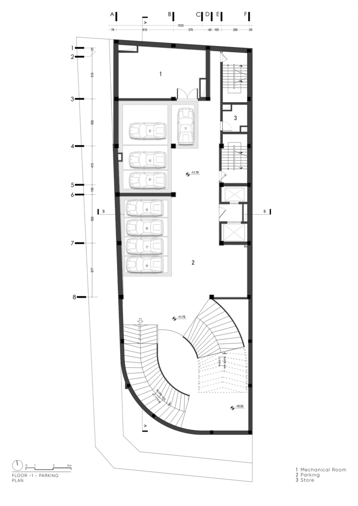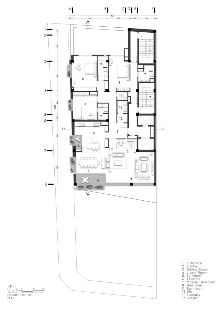 طبقه اول ساختمان شامل یک لابی و یک سالن اجتماعات است، در حالی که طبقه دوم میزبان یک سالن ورزشی است. ۹ طبقه بعدی هر کدام یک واحد مسکونی را در خود جای می دهند. سطوح زیرزمین امکانات پارکینگ و استخر شنا را برای ساکنین فراهم می کند.