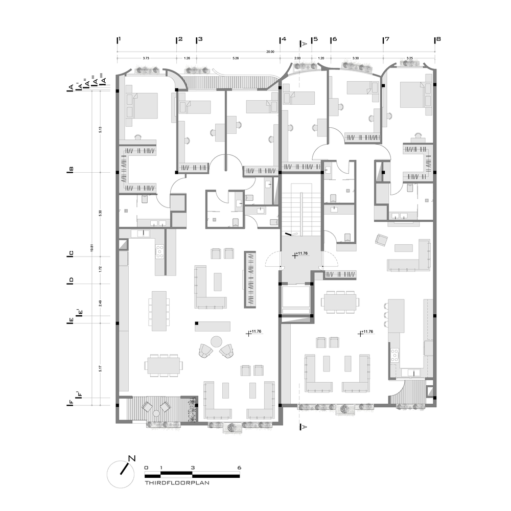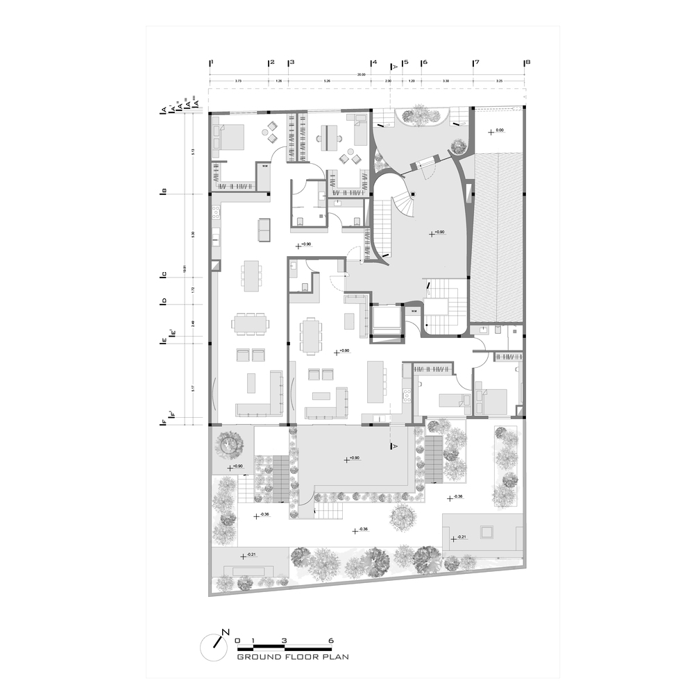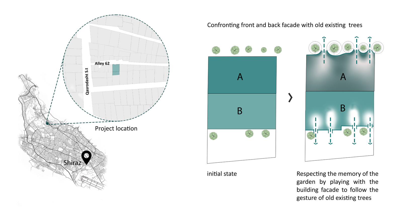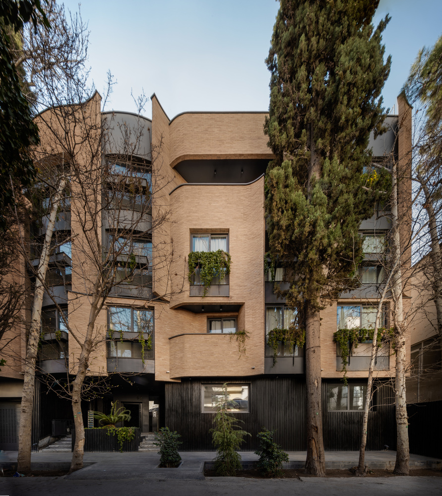 درختان کهنسال روبروی پروژه واقع در مرز بین کوچه و نمای شمال غربی قرار دارد. یکی از دغدغه های اولیه ما اتصال درختان کهنسال به فضای داخلی بود. نما با حفظ درختان موجود شکل خود را به خود گرفت و پانل ها در اطراف درختان حرکت کردند. یکی دیگر از دغدغه های این پروژه ارتباط محیط اطراف ساختمان با فضای محله بود. با حرکت پانل های نما به جلو و عقب، ارتباط بصری مخاطب با پروژه حتی از راه دور ایجاد شد.