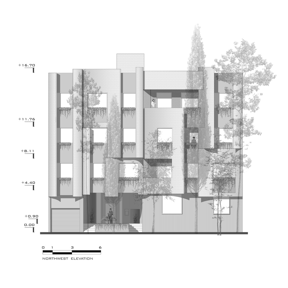 بازدیدکنندگان می توانند فضای سبز را در فضایی سه بعدی تجربه کنند، زیرا پوشش گیاهی از نما شروع به حرکت می کند، از کف حیاط می گذرد و تا دیوار مقابل امتداد می یابد و خاطره باغ های قدیمی را به یاد می آورد. با توجه به چنین ویژگی در این پروژه، قاب هایی جلو پنجره ها طراحی شده تا نمای جلو را قاب بندی کند. تیم طراحی این پروژه امیدوار است که با پرداختن به ارزش های اجتماعی و زیست محیطی در این گونه پروژه ها بتواند بر کیفیت طراحی پروژه های اطراف اثرگذار باشد.