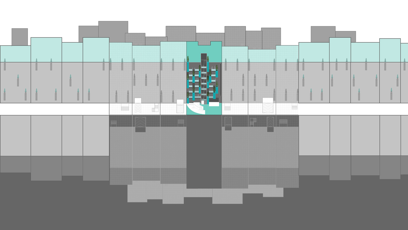نوع شناسی مسکونی فعلی “پر کردن” نیاز به بازنگری های اساسی برای بهبود محیط زندگی ساکنان دارد. در معماری ساختمان مسکونی توحید فلاور باکس های روی نما نه تنها فضاهای داخلی را بر اساس شبکه مدولار ساماندهی می کنند، بلکه نما را به یک باغ عمودی تبدیل می کنند. یکی دیگر از الحاقات سبز و پایدار به ساختمان توحید، بام سبزی است که در ماژول هایی از باغ های خوراکی برای استفاده ساکنان شکل گرفته است. حفره های موجود در سطوح زیرزمینی نفوذ نور خورشید را میسر کرده اند و جو این فضاهای با کیفیت پایین را تقویت کرده اند.