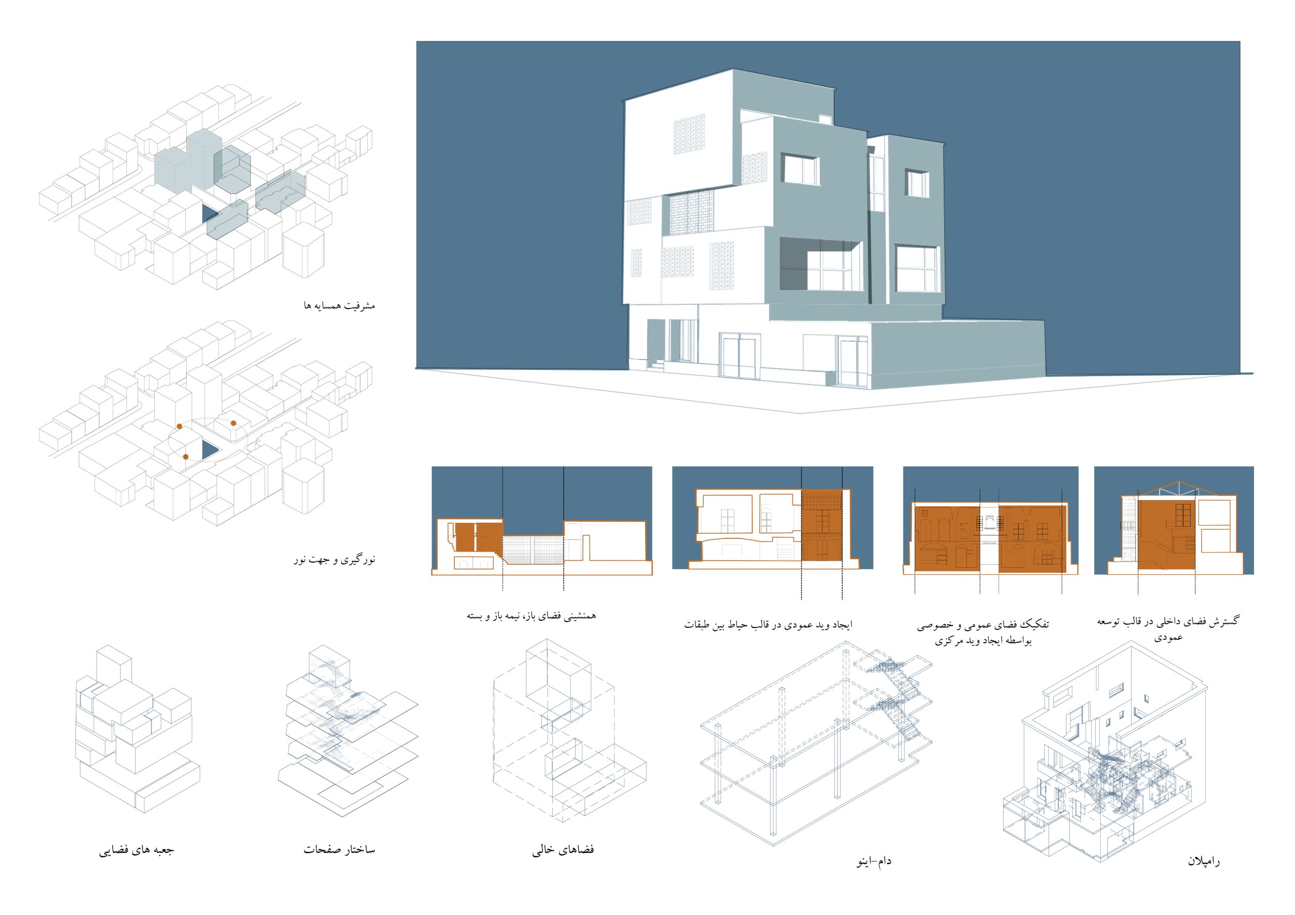 مهم ترین مساله معماری سازماندهی خلاقه فضاست. در معماری گذشته ایران مساله فضاهای خالی همیشه مطرح بوده است. تمرکز بر تولید ایده ای برای کمرنگ کردن مرز فضاهای باز، نیمه باز و بسته موجب شد تا نگاهی کانسپچوال به معماری و تایپ های بومی مسکونی بواسطه خوانش آنها در شهر داشته باشیم و به دنبال آن به گسترش و تزریق این رویکرد که از مطالعه تاریخ بدست آمده است در کالبد پروژه بپردازیم. همچنین از طریق تفکیک ساختارهای حجمی درون پروژه که بخشی از آن بر مبنای جایگذاری منظم جعبه های فضایی و صفحات بر روی هم و دیگری بر مبنای جایگذاری ناهمگن جعبه های فضایی و شکست صفحات شکل گرفت در پی آن بودیم که ساختار فضایی یکنواخت موجود شکسته شود. جعبه های فضایی جزء های مستقلی هستند که در کنار یکدیگر به عنوان یک کل منسجم عمل میکنند.