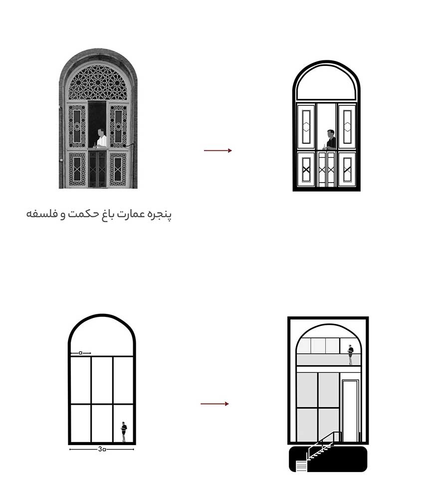 نمای یک بنا متعلق به سیمای عمومی است و علاوه بر برآوردن حس زیبایی می تواند داستان دیگری هم برای گفتن داشته باشد. از آنجا که بناهای ما صاحب فرم ها و هندسه های موزون و تناسبات متعددی هستند، در این طراحی تصمیم گرفته شده که الگوهای مشابه به رغم ایجاد اصالت هندسه های تاریخی زنده نگه داشته شوند. به همین منظور نمای اصلی با ایجاد حس تداعی بناهای اشکانیان مانند بازه هور، کاخ کوه خواجه شکل گرفته است. چرا که بناهای تاثیرگذار در تاریخ معماری می باشند.