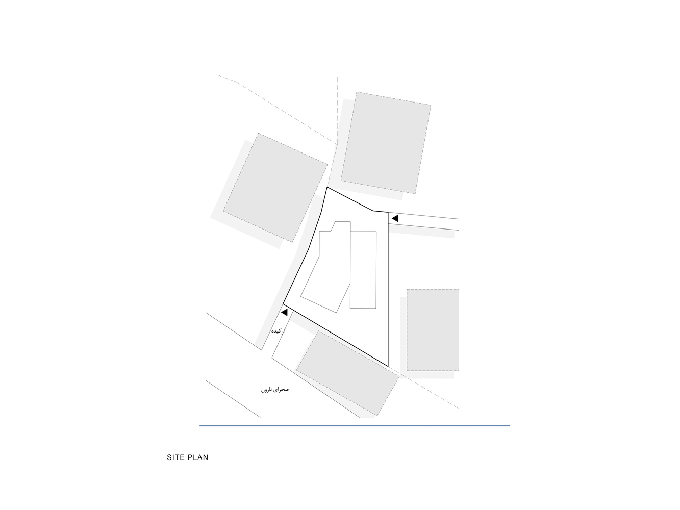 - اول موقعیت مکانی و موقعیت هندسی سایت بوده است. بر خلاف سایت های معمولی، این قطعه از چهار طرف توسط همسایگان احاطه شده است. تنها راه دسترسی آن به معبر اصلی دو کوچه به عرض ۳ متر در شمال و جنوب آن است. هندسه نامنظم سایت و زوایای ناهمگون همسایه ها نسبت به سایت از جمله موارد پیش رو در طراحی این بنا بوده است.