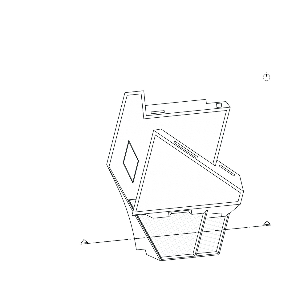 اگرچه این قطعه نسبتاً بزرگ است و تا واترمارک بالا امتداد می یابد، منطقه واقعی قابل ساخت محدود شده، و بیشتر با الزام برای پارکینگ ماشین و تأمین چرخش در سطح همکف به چالش کشیده شده است. محل اقامت داخلی با اتاق نشیمن و اتاق خواب مستر در طبقه اول چیدمان شده است. یک بالکن طاقدار طبقه اول بر فراز تپه های شنی معلق است و مشرف به ساحل و کانال فراتر از آن است. یک تراس خصوصی در سطح نیم طبقه و اتاق خواب های اضافی در طبقه همکف در محیطی صمیمی تر در زیر تپه های شنی قرار دارد. ارتفاع در کنار دریا، منطقه نشیمن با ارتفاع دوبل را با پنجره بزرگ مثلثی ناقص رو به دریا برجسته می کند. نمای شیبدار فضای نشیمن با روکش چوبی خارجی بازتاب بدنه معکوس کشتی ها است که دائماً در افق ظاهر می شوند.