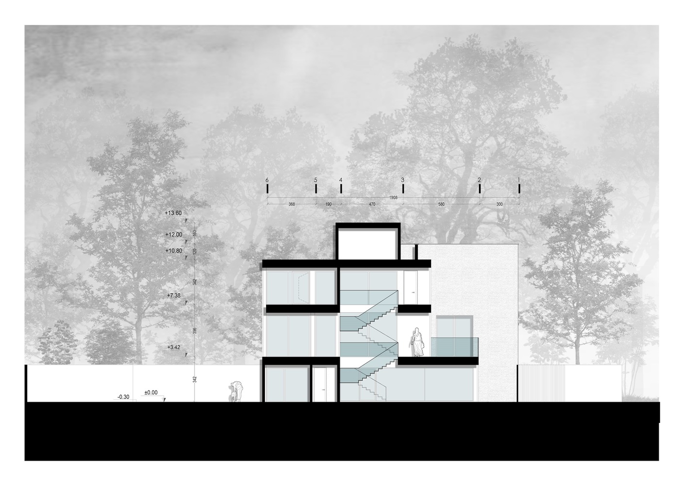 طراح ویلا خود را با دو جهت متمایز نشان می دهد: یک طرف رو به بیرون و کوچه، حسی از حریم خصوصی و صمیمیت را ارائه می دهد، در تضاد با نمای حیاط که حجم سنگ از نظر زیبایی شناسی طراحی و حجاری شده است. این پروژه از بیرون اسرارآمیز و دعوت کننده است و بینندگان را به کاوش در فضای درون به چالش می کشد در حالی که در درون، این رمز و راز به وضوح و باز بودن تبدیل می شود.