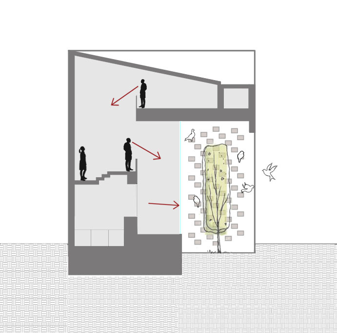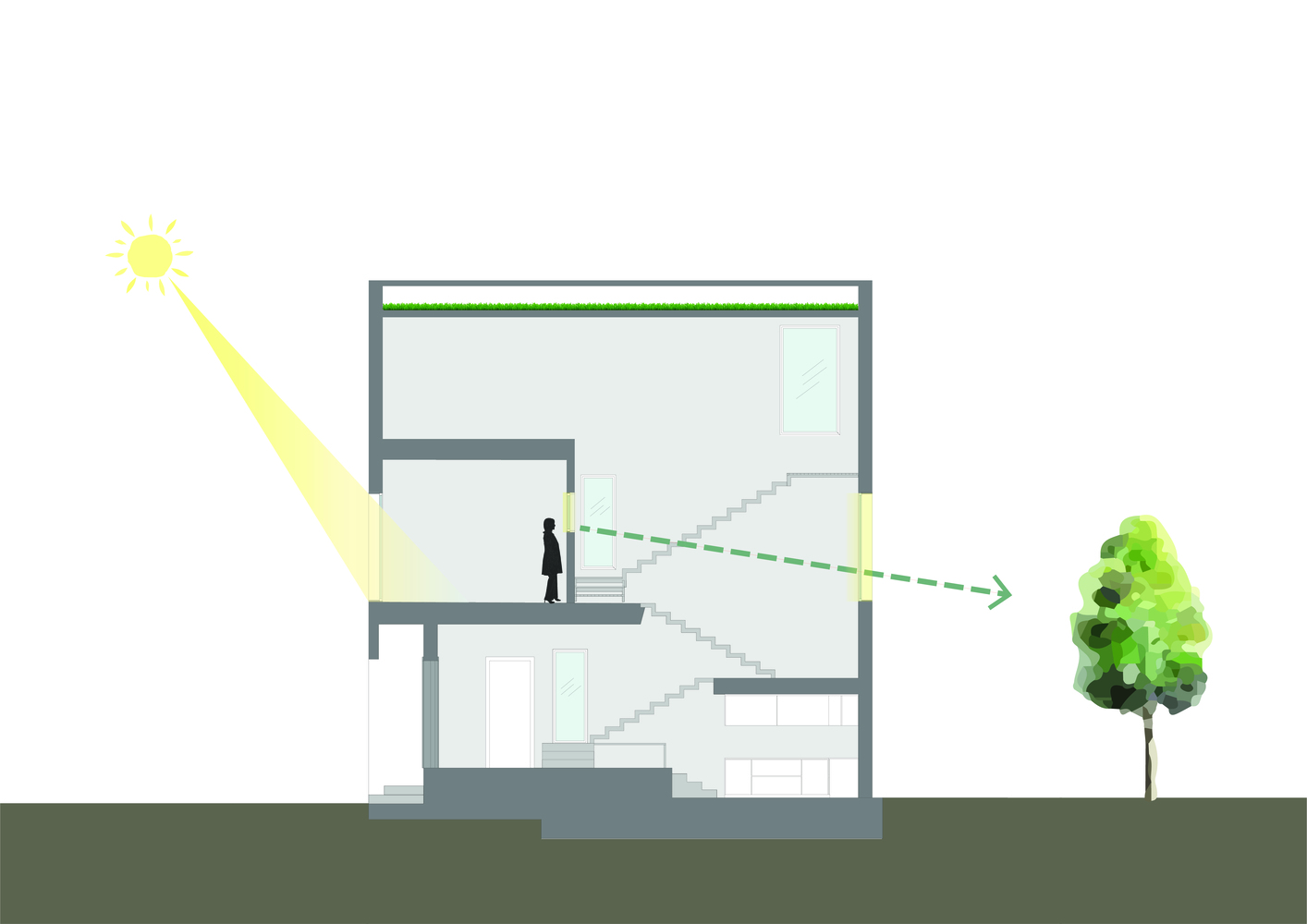 بنابراین در طراحی این فضا علاوه بر ایجاد توالی های مختلف دید و پرسپکتیو بیرونی، شاهد تابش نور از زوایای مختلف دید، و در نتیجه بازی رقص نور با تغییر در زاویه تابش خواهیم بود. علاوه بر این، این نوع طراحی چیدمان پنجره، در زوایای مختلف پیش نویسی ایجاد کرده است که با اقلیم منطقه سازگار است. موقعیت راه پله ها به شیوه ای طراحی شده که در هر طبقه متفاوت باشد و به عنوان محور گردش عمودی، به فضایی بدل شده است که بیننده را به جستجو در فضا دعوت می کند. این فضا تا جایی مورد اهمیت قرار گرفته که پنجره ای از یکی از اتاق خواب ها به سمت راه پله طراحی شده تا کاربر بتواند بازی بخش راه پله را علاوه بر منظره، از پنجره اتاق در نما مشاهده کند.