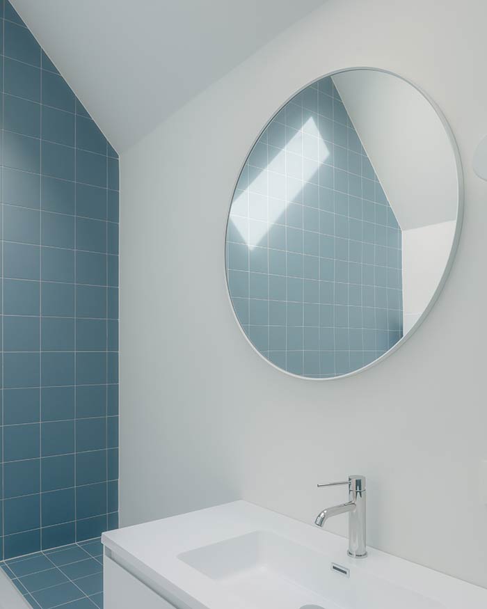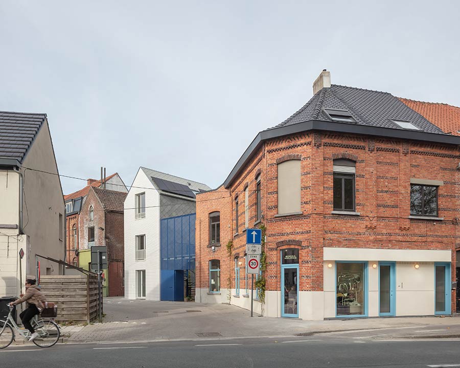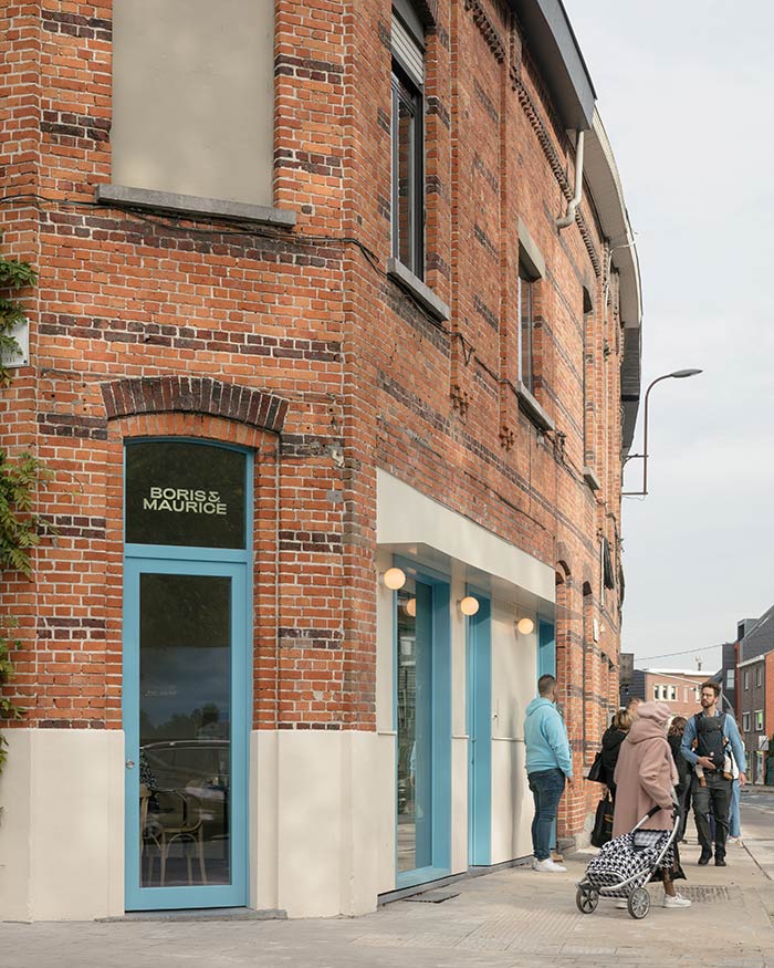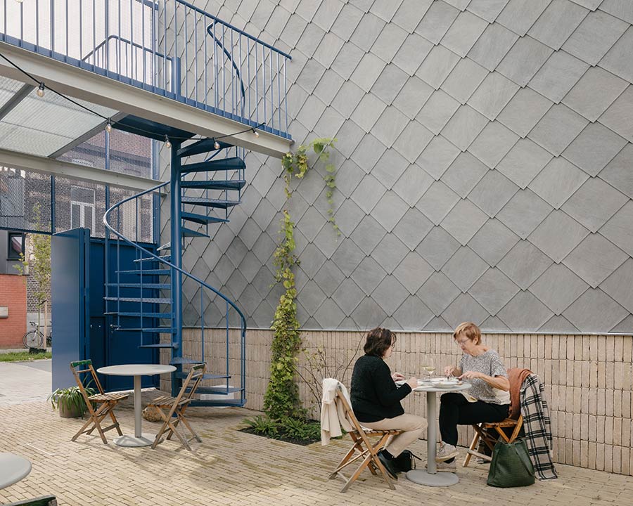 در پشت این مانع فولادی سوراخ دار، ورودی کافی شاپ و یک اقامتگاه همراه آن در بالا پنهان شده است. درهای دو لولایی با مهندسی هوشمندانه، ادغام بینقص تراس را با صحنه شلوغ خیابان تسهیل می کنند. آجرهای سفالی مرتفع روی نماها، فضای بیرونی را با حس آرامش بصری اشباع می کنند و نماها و پرداخت های متنوع آن را تکمیل می کنند.