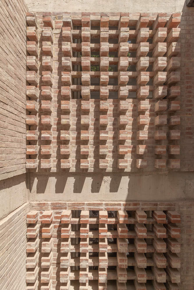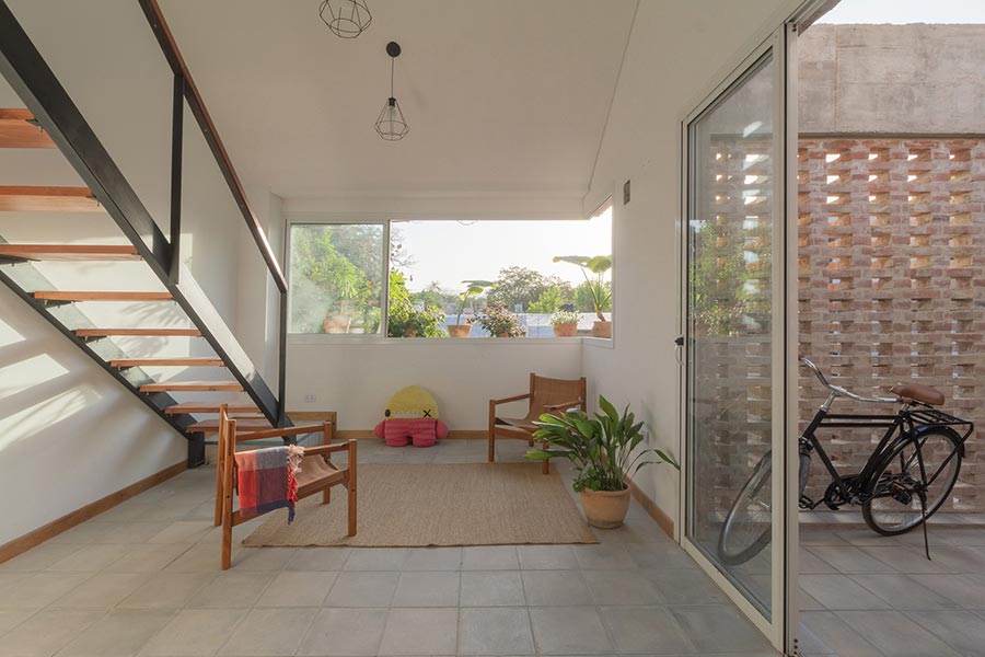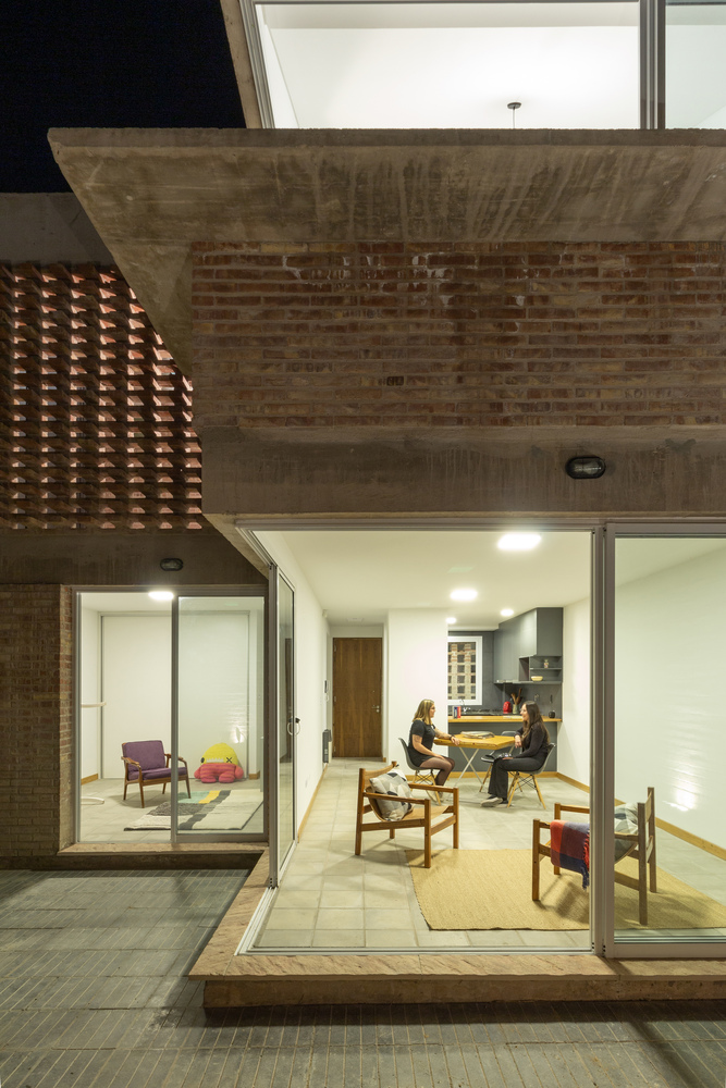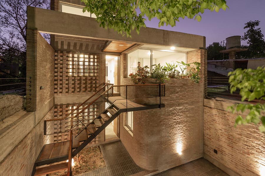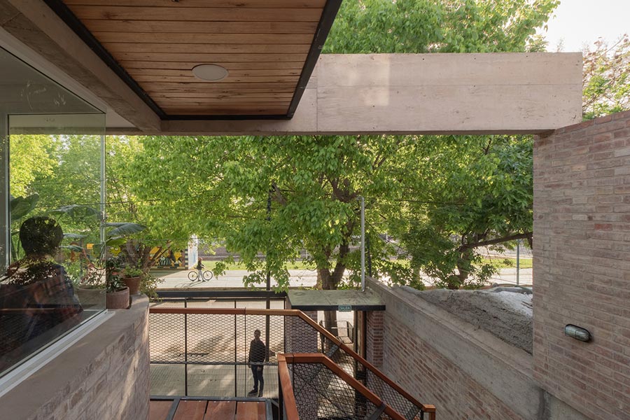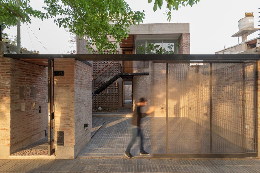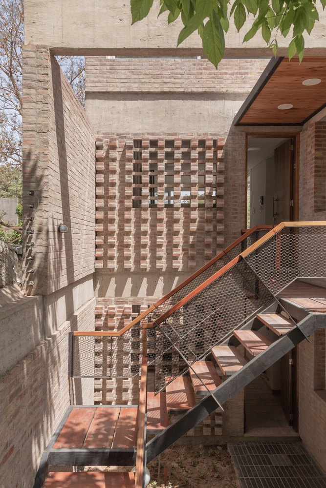 مصالح (آجر در ساختمان مسکونی دوبلکس): یک تیر بتن مسلح در نما، دسترسی را قاببندی میکند، از پوششهایی که از پیادهرو و پلهها در برابر آفتاب و باران محافظت میکنند، پشتیبانی میکند و از نیمطبقه مربوط به واحد دوم پشتیبانی میکند. مجموعه تیرها، سقفها، پیادهروها و پلهها، فضای سبزی را احاطه کردهاند که به عنوان یک گذرگاه بین بیرون و داخل، فضای شهری و خصوصی عمل میکند. بتن اکسپوز خام بدون پرداختهای اضافی در ترکیب با آجر که به روشهای مختلف استفاده شده است، منجر به زیباییشناسی ساده و بیتکلف میشود. راهپله و یک پیادهرو فلزی به عنوان عناصر متصل، ظریف و سبکی در نظر گرفته میشوند که از نظر بافت و بیان با مصالحی که سازه را تشکیل میدهند، در تضاد هستند. این زبان، که به دنبال بیان هر ماده به عنوان خود است، در کار استودیو ثابت است، شیوهها را زیر سوال میبرد و سعی میکند هر عنصر را توجیه کند.
