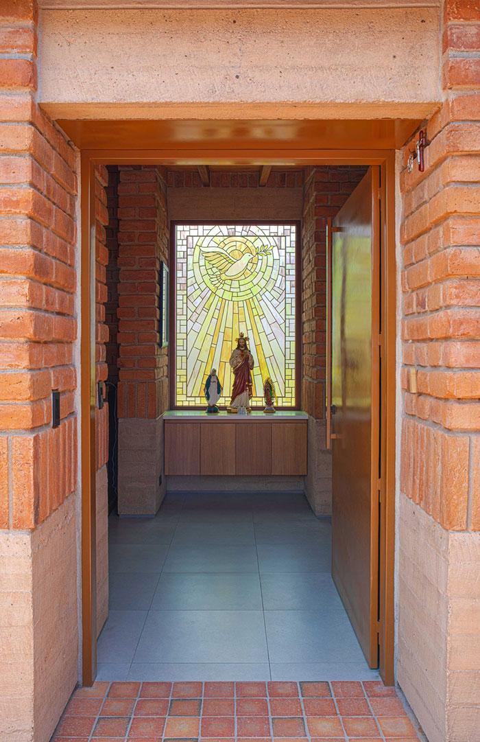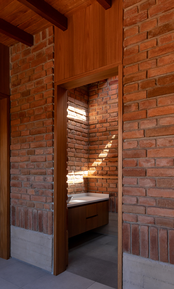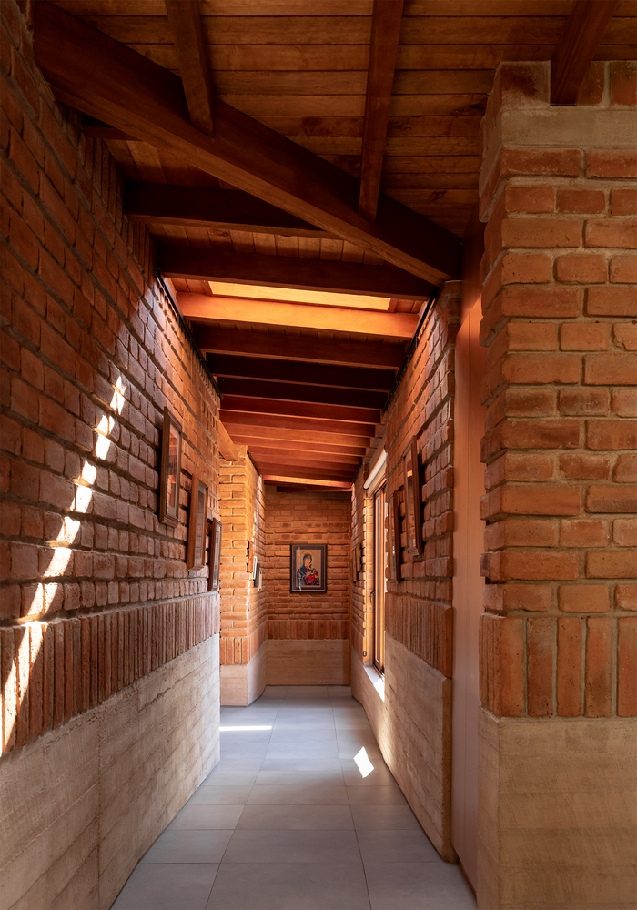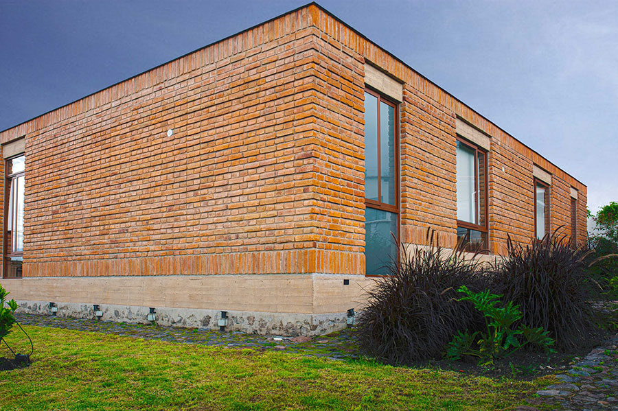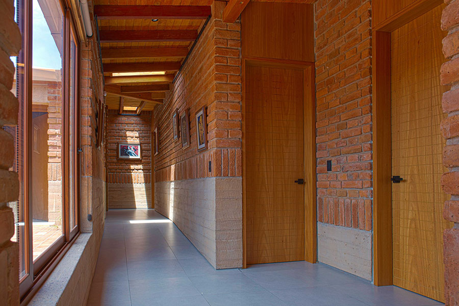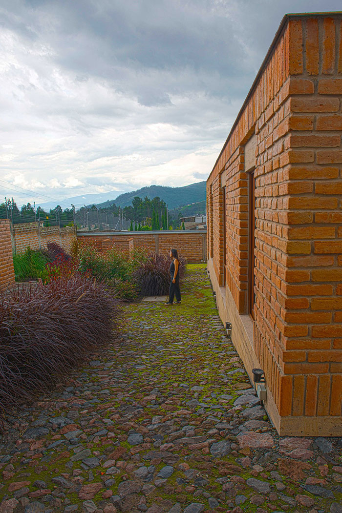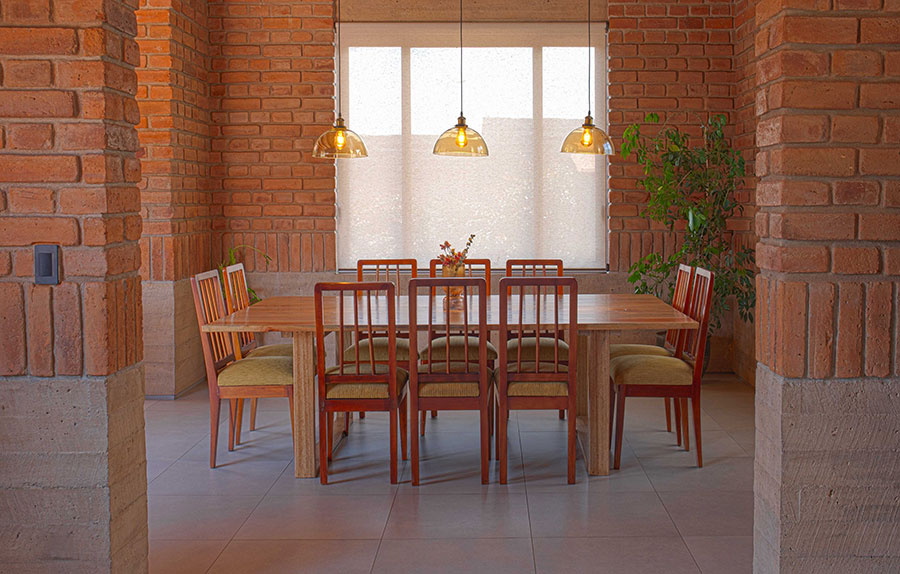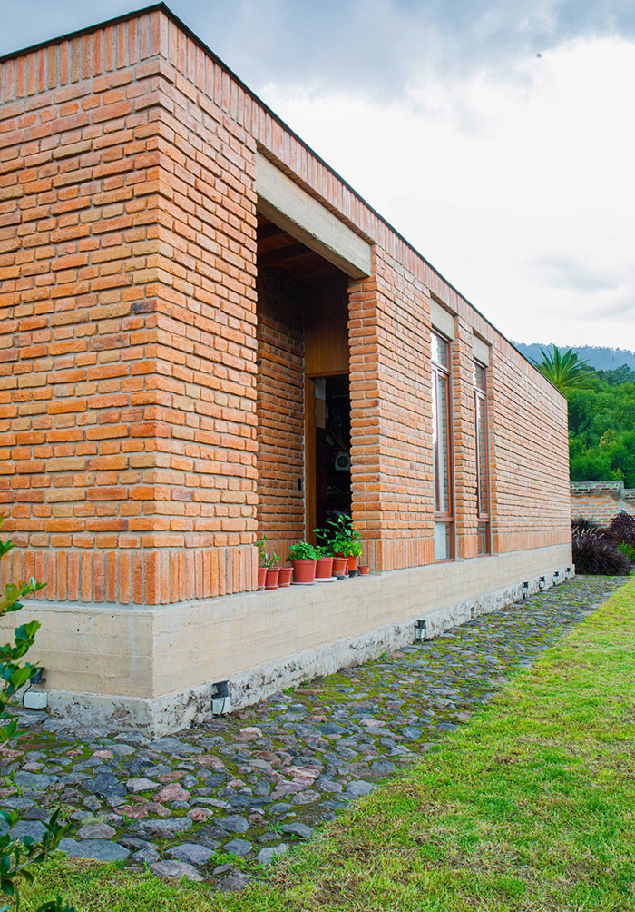 دیوارهای خانه از آجر سنتی ساخته شده اند که از همان دامنه های آتشفشان تهیه شده است. ناهمواری و نامنظمی آجرها، حس طبیعی و دست ساز بودن را به خانه می بخشد و آن را از ساختمان های معمولی متمایز میکند. سقف چوبی خانه نور را به زیبایی در فضا پخش میکند و سایههای پویا و دلنشین خلق میکند؛ سایههایی که باعث میشوند خانه هم گرم و صمیمی باشد و هم آرامش بخش.