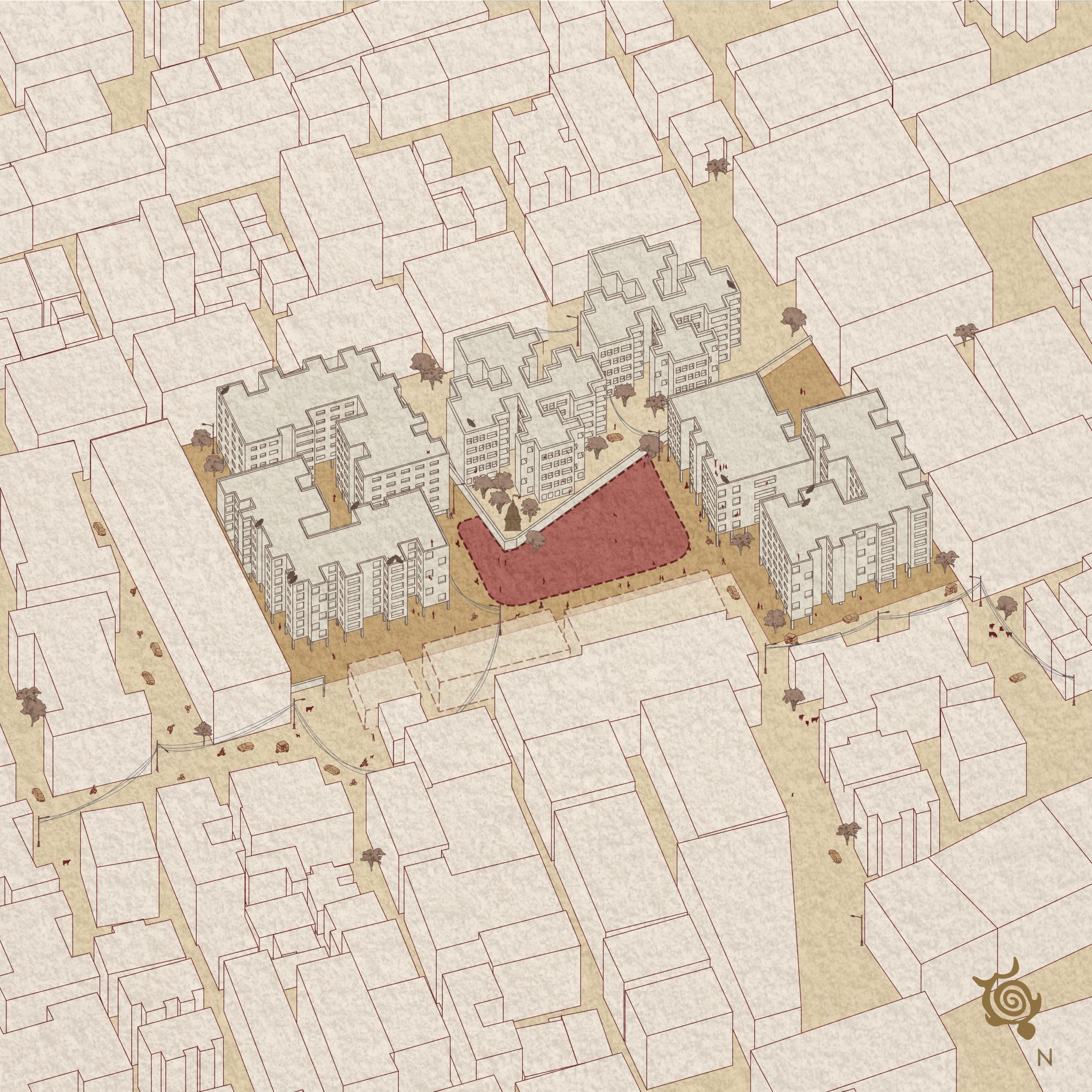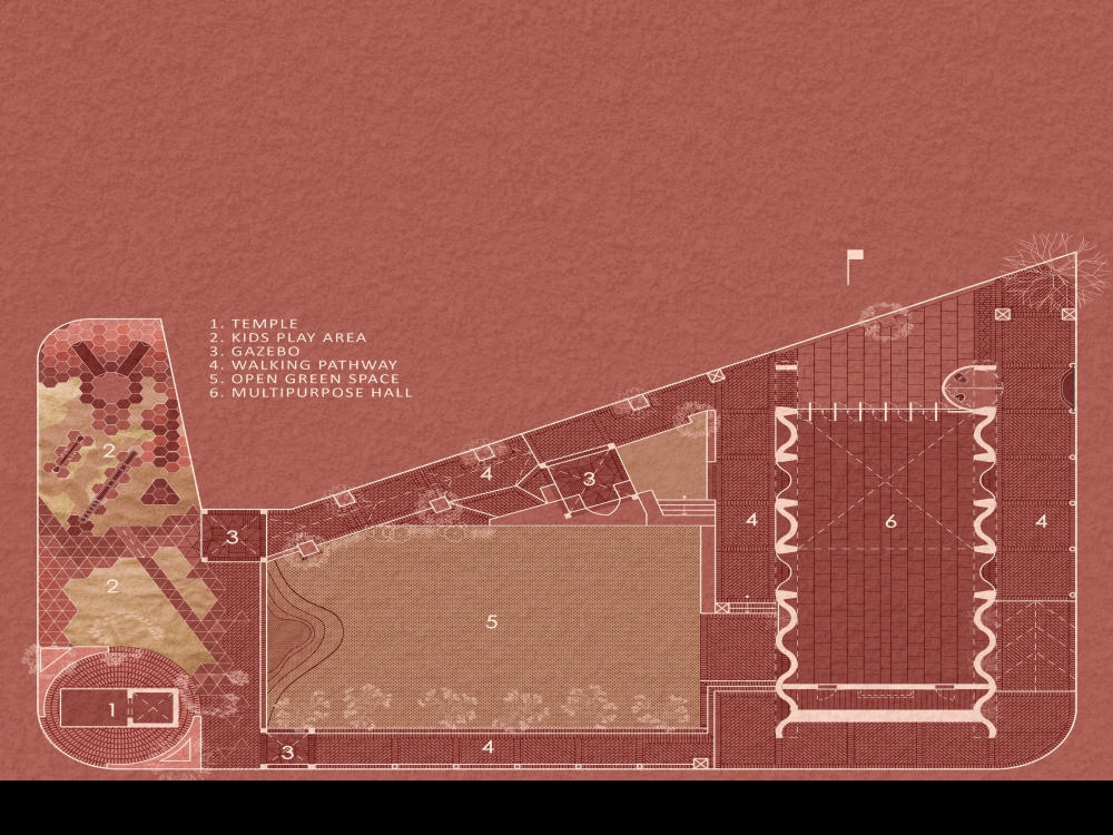 “واحه سرخ” آزمایشی مشابه است که فضای باز کوچکی را در محله ای پر از مجتمع های مسکونی جشن می گیرد و سعی می کند یک ایده آل برای یک سبک زندگی جایگزین ایجاد کند. با درک شیوه های فعلی زندگی آن مردم، یک برنامه جایگزین ایجاد شده که شامل یک سالن اجتماعات چند منظوره، یک زمین بازی، یک کتابخانه، محل های نشستن، مسیرهای پیاده روی، یک آمفی تئاتر در فضای باز و یک معبد بود. با مساحت کل ۷۱۵ متر مربع، این تنها فضای باز باقی مانده پس از پروژه های ساخت و ساز انبوه است که اطراف را احاطه کرده اند. بنابراین، فلسفه طراحی بر حفظ فضای باز و ساختمان با حداقل ردپا متمرکز بوده است. بر این اساس، بخش عمده ای از پروژه پوشیده از سبزه ها و درختان است که آن را محصور کرده و از اطراف جدا می کند و در خود اکوسیستمی ایجاد می کند.