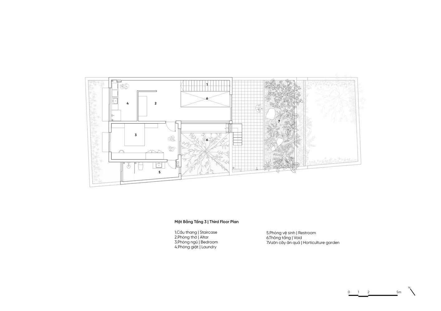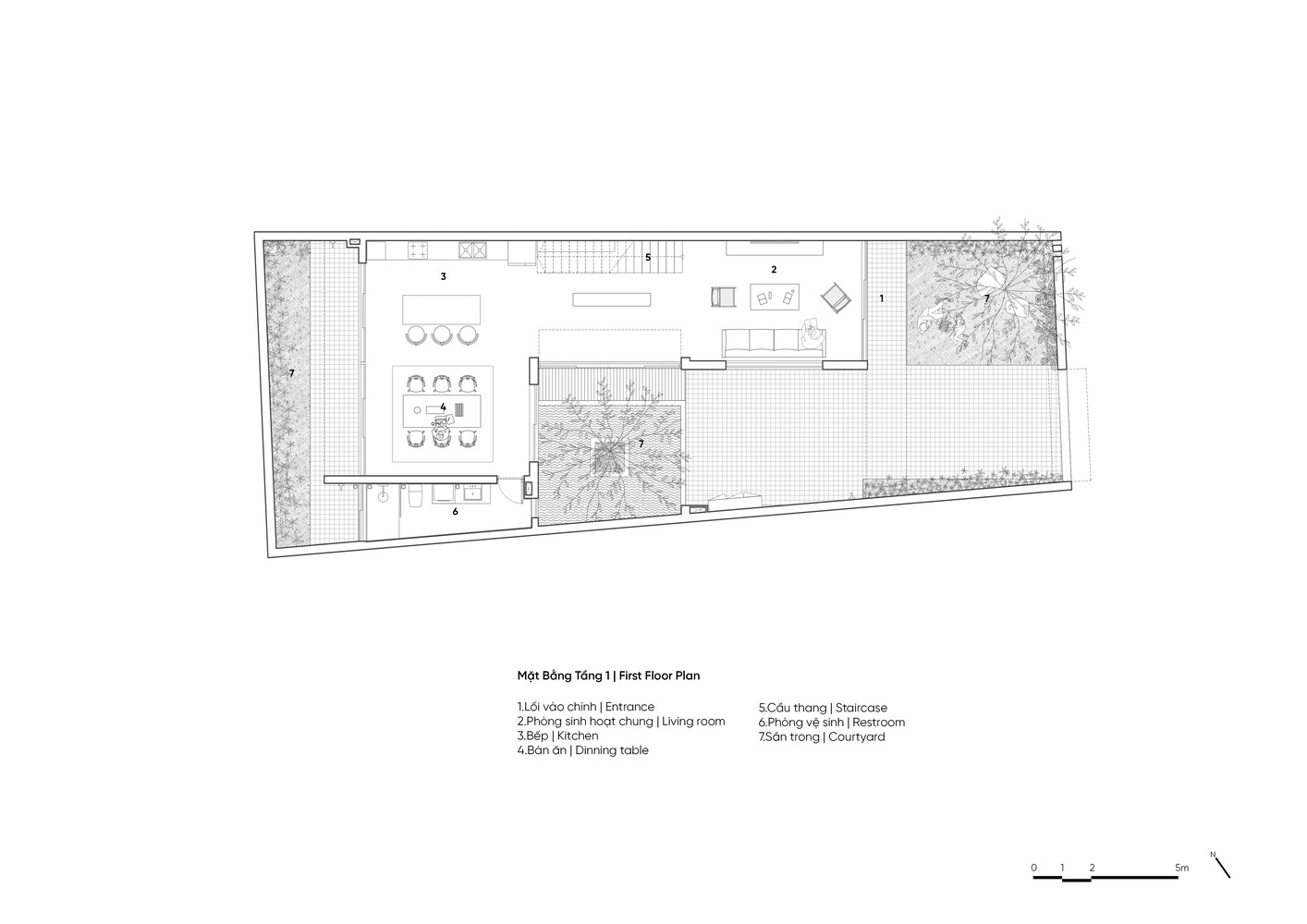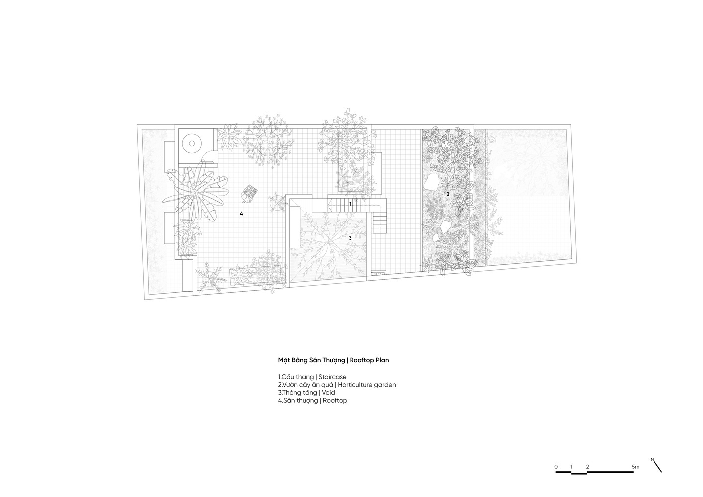 محوطه ساخته شده به شکل ذوزنقه با مساحت سایت ۲۲۶ متر مربع، نما ۸ متر و عمق ۲۵ متر است. طراحان از این طول استفاده کرده اند تا در مورد خانه ای با لایه های مختلف فضا، از بیرون به داخل ایده داشته باشند. این سایت به پنج بخش با اندازه های مختلف برای عملکردهای مختلف تقسیم شده است. دو قسمت در وسط فضاهای نشیمن است، بقیه فضا برای درختان و سطح آب است. بنابراین، خانه در سراسر فضا از بیرون به داخل با لایه ها و درختان در هم تنیده است. هر فضای زندگی دارای دو ضلع باز درختان و آب های سطحی است.