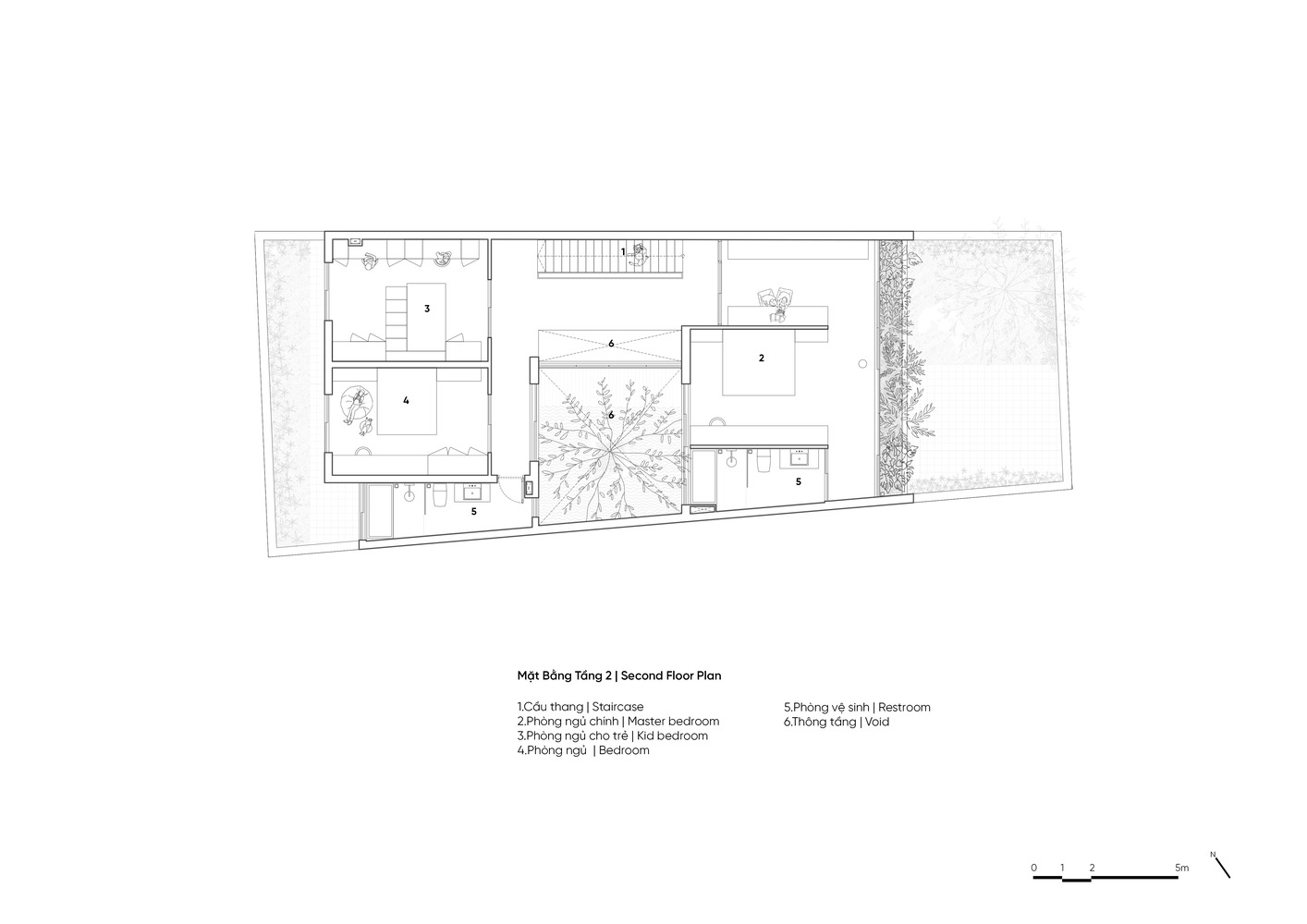 بین این دو بلوک فضایی برای پله ها، راهروهای ترافیکی و سطوح آب وجود دارد. این منجر به ایجاد خانه ای شده است که در آن همه فضاها در معرض طبیعت و آب هستند. هنگام حرکت به داخل خانه، از بیرون به داخل، از پایین به بالا، با فضاهای باز مواجه می شویم که به افراد کمک می کند تا به خوبی با طبیعت، درختان و نور طبیعی در تماس باشند. این خانه تنها ۲.۵ طبقه دارد اما هنوز تمام فضاهای لازم شامل چهار اتاق خواب، یک اتاق عبادت و رختشویی در طبقه آخر را دارد. در طبقه اول، جایی که فضای مشترک شامل اتاق نشیمن، آشپزخانه، غذاخوری، سرویس بهداشتی و … است که فضاها بین باغ ها و دریاچه بزرگ چیده شده اند تا فضایی آرام را ایجاد کنند.
