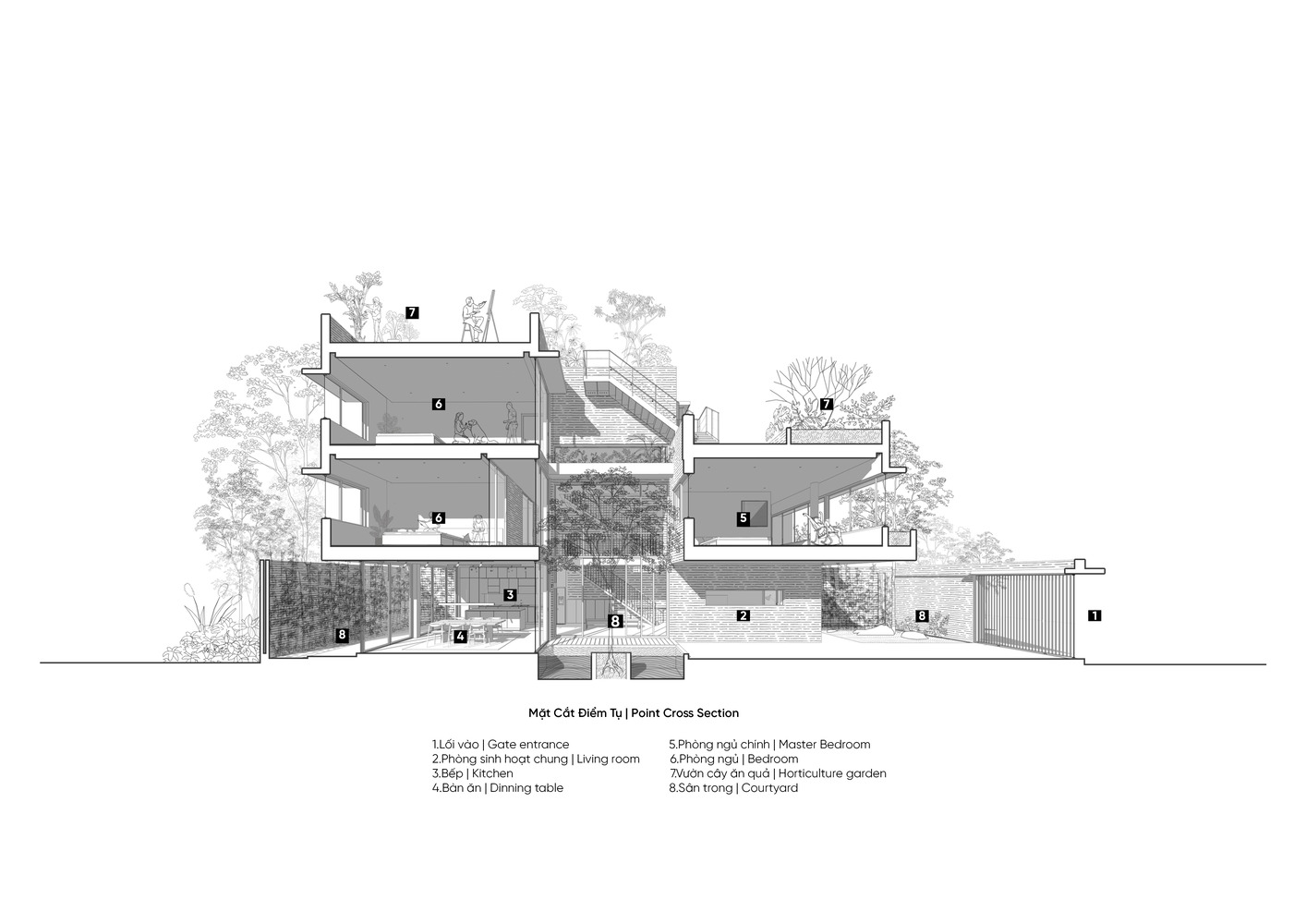این خانه برای یک خانواده جوان با دو فرزند طراحی شده است، جایی که آنها وقت خود را صرف مراقبت از خانواده و درختان خود می کنند. مبلمان در خانه نیز به طور معقول و ساده اما کاملاً مجهز برای زندگی انتخاب و چیده شده است. فضاهای خانه طوری چیده شده اند که رو به طبیعت و رو به یکدیگر باشند تا فضایی را ایجاد کنند که مردم را با مردم و مردم را با طبیعت پیوند دهد. در هر موقعیتی از خانه، افراد می توانند یکدیگر را ببینند، همچنین می توانند درختان و سطوح آب و غیره را ببینند. علاوه بر این، ما می توانیم هوا، صدا و نور خورشید را احساس کنیم.