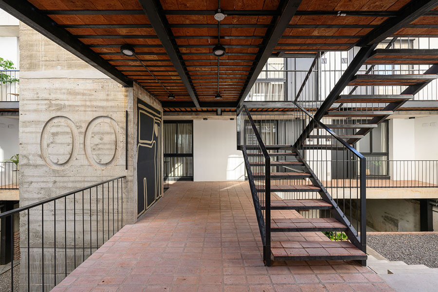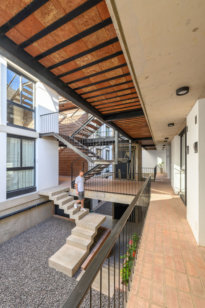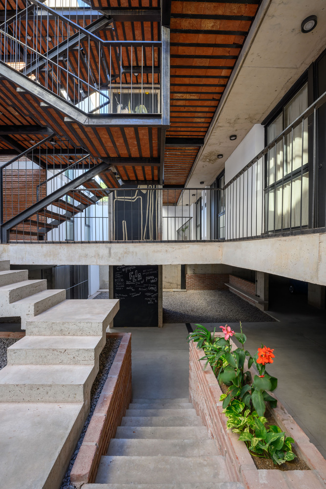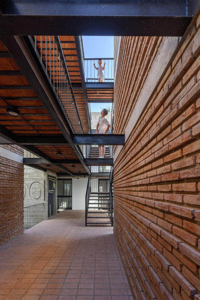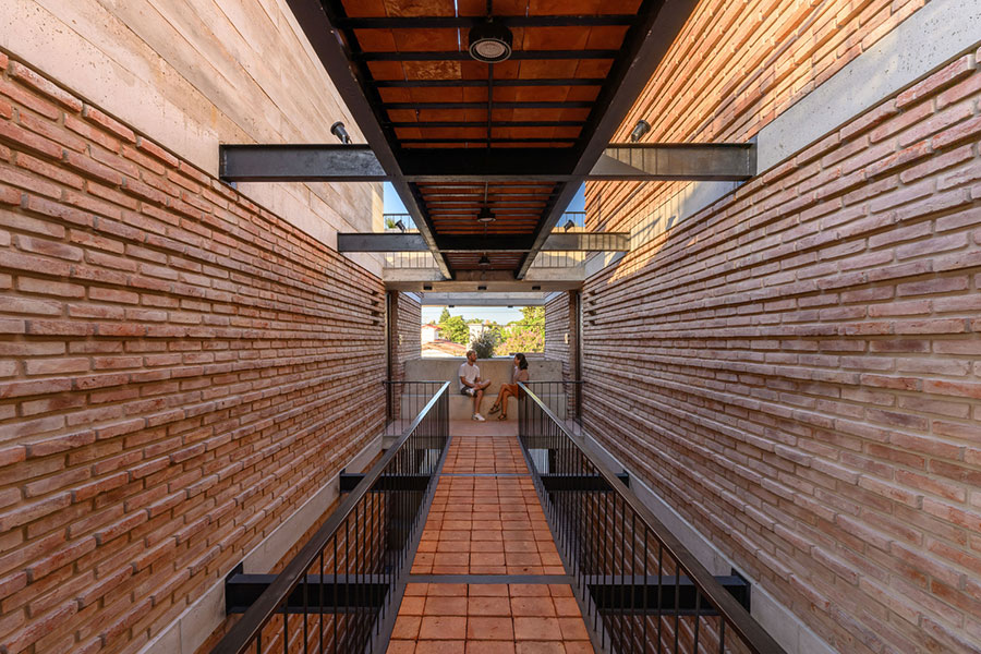 این بنا حول سه بلوک ساخته شده در اطراف یک هسته مرکزی که گردش مشترک را غیرمادی می کند، ساخته شده است و پله ها و راهروها را به سادگی به پیاده روها، حیاط ها و فضای عمومی تبدیل می کند، از طریق توسعه یک گذرگاه فلزی آجری که ریتم بصری راهروها را همراهی می کند. فضای خالی بزرگ و تهویه شده به عنصری از کنترل آب و هوا، جلوه های بصری، نور و سایه، برخوردها، ماندگاری و سنت تبدیل می شود. نمای بیرونی ما را به یاد فضای داخلی میاندازد. فضاهای جادار، تهویه مناسب و روشن به لطف استفاده متعادل از منابع محیطی به دست آمده اند. مادیت با محل کاشت همراه است، با زمینه مرتبط است و به دنبال ارائه ارزش حسی با بافتها، رنگ های ارگانیک و فرم های ناقص و نامنظم است و فضاهای ساده ای را ایجاد می کند که با زندگی در خانه همراه است.
