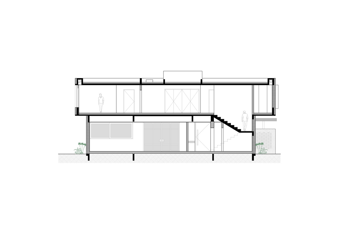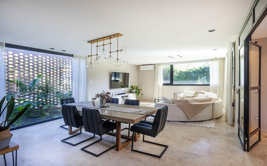 در طبقه همکف، طرح کلی حول محور تعامل بین فضای نشیمن/ناهارخوری بزرگ، آشپزخانه و گالری می چرخد، که هر فضا در یک گفتگوی هماهنگ درگیر است. این فضاهای داخلی که با حیاطهای سبز تقویت شده اند، نه تنها حس تازگی و سرزندگی را به ارمغان می آورند، بلکه به لطف دیوارهای آجری با دقت ساخته شده، نور و سایه را به طرز هنرمندانه ای دستکاری می کنند و در عین حال حریم خصوصی را از دنیای بیرون نیز فراهم می کنند.