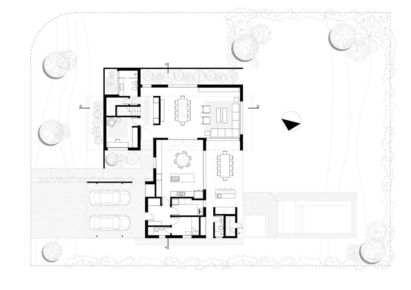 ورود به خانه شما را به یک حیاط سبز دلباز می رساند که توسط دیوارهای آجری مشترک با طراحی پیچیده محصور شده است و ورودی عابر پیاده را از پارکینگ جدا میکند. این حیاط سبز نه تنها فضایی دنج و خلوت را ایجاد میکند، بلکه پیشنمایشی از تجربه طبیعی در انتظار داخل خانه نیز میباشد.