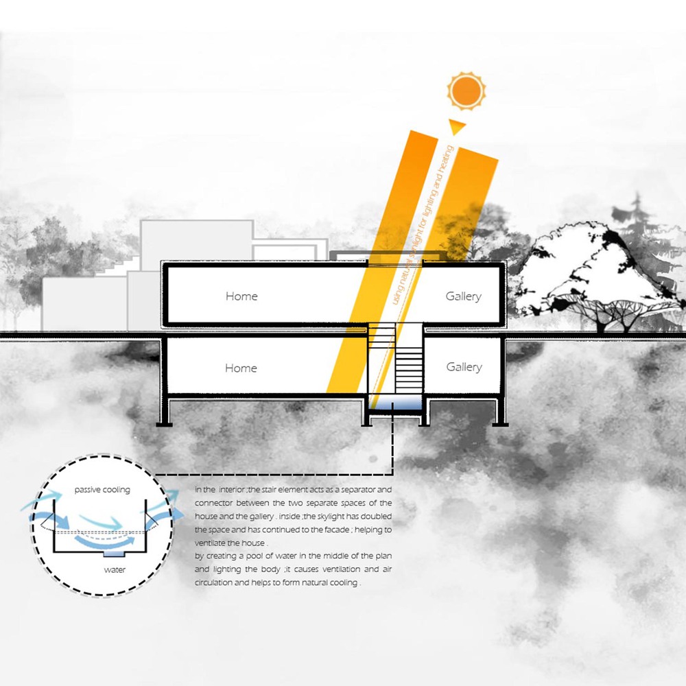 هدف اولیه مشتری حفظ ساختمان موجود، استفاده از طبقه فوقانی به عنوان محل زندگی و وقف زیرزمین برای نگهداری مجسمه ها و کالاهای وارداتی بوده است. با این حال، دید اولیه مشتری، دوباره تصور شده است و خانه و انبار در یک موجودیت منسجم ادغام شده است. مفهوم معاصر حاصل به عنوان یک فضای گالری تحقق یافته و به نام «گالری خانه» نامگذاری شده است. این رویکرد دگرگون‌ کننده به خانه هویتی کاملاً جدید بخشیده و آن را از یک طبیعت دوگانه به یک وحدت تجزیه ناپذیر تغییر داده است.
