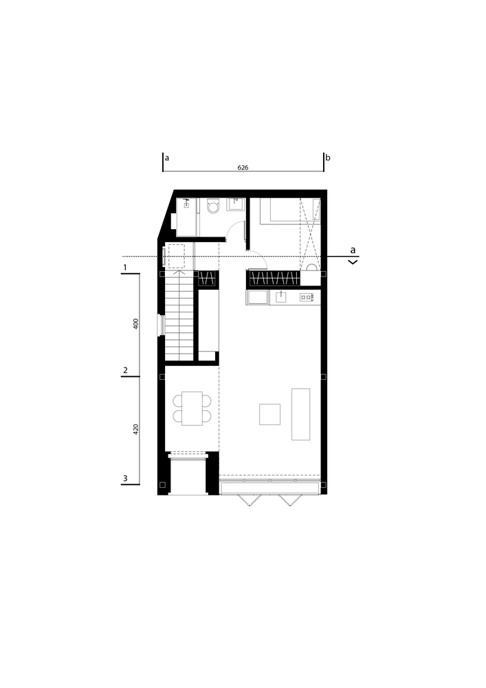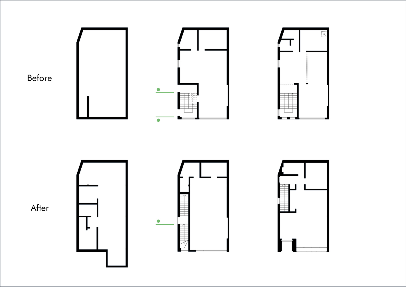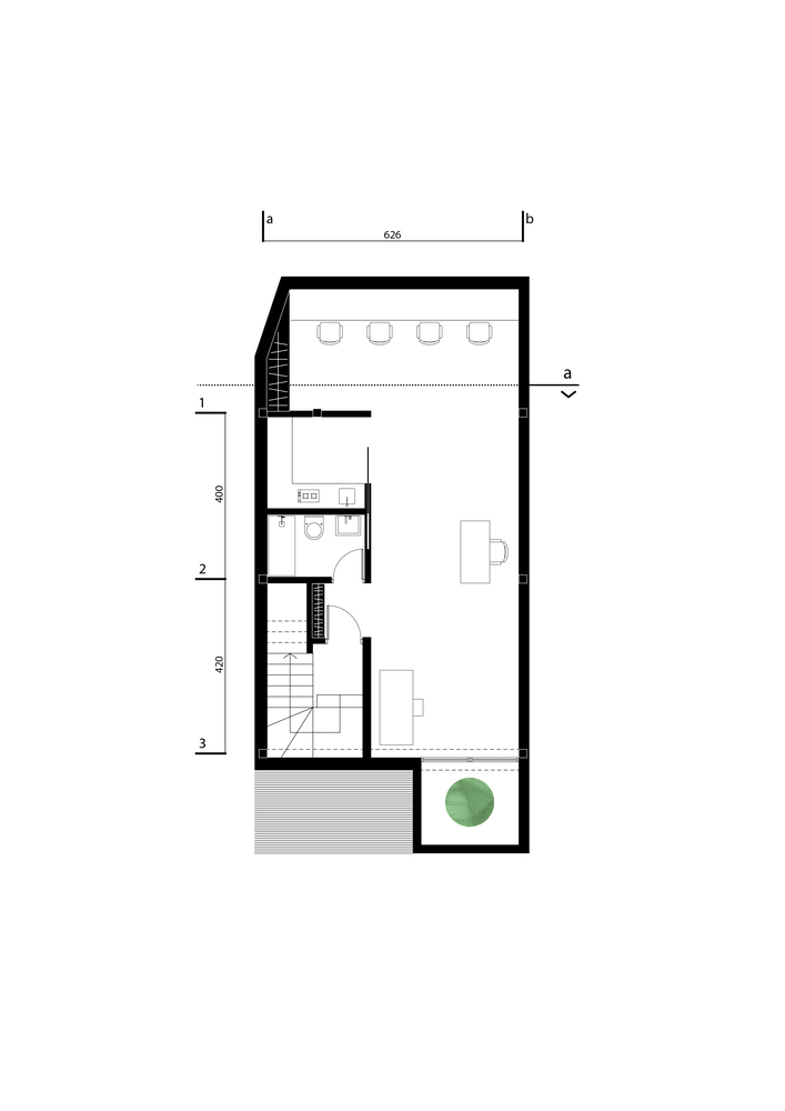 ابتدا با هدف تفکیک دسترسی، دسترسی به بخش تجاری فقط از طریق خیابان اصلی و دسترسی به بخش مسکونی و اداری از طریق خیابان فرعی امکان پذیر بود. با توجه به محدودیت های مالی و مکانی پروژه و اینکه با هدف سودآوری مشتری طراحی می شود، رویکرد طراح به جای ایجاد فضای خاص، افزودن ارزش با کمترین هزینه بوده است. طبقه همکف: افزودن یک کافه به طبقه همکف نیاز به حفظ ارتباط بین حیاط و فضای تجاری را تقویت کرده است.