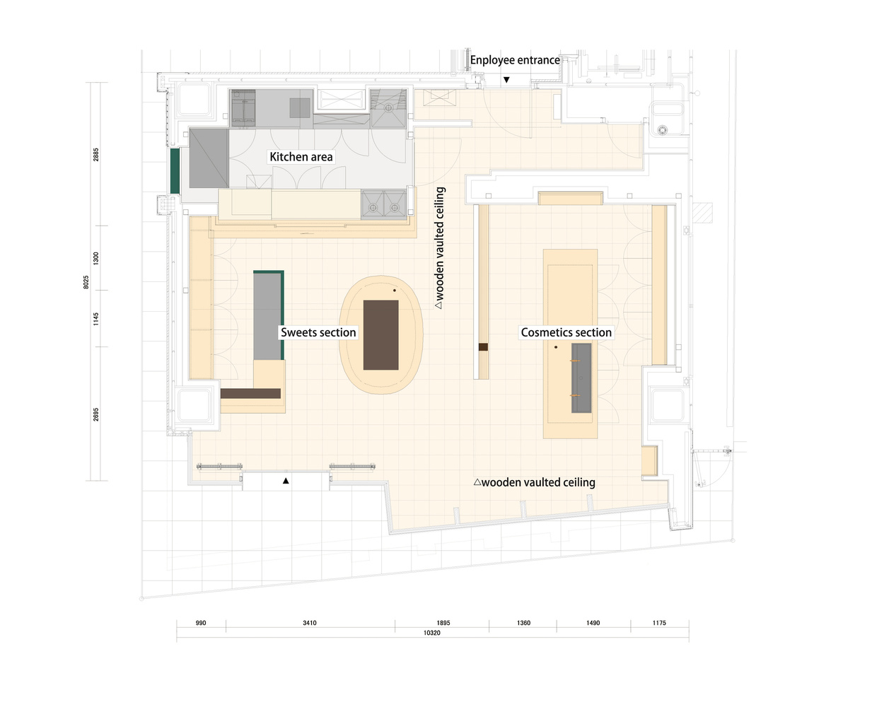 این مغازه به عنوان یک ساختمان یک طبقه با ارتفاع سقف ۵.۳ متر، واقع در منطقه درجه یک در گینزا، در محیطی بسیار مطلوب قرار دارد. در این محیط، سقف عظیمی از چوب طراحی شده است. در بالای فضای سبز عمیق فروشگاه – سبزی بر اساس تصویر جنگل هینوکی ناکاتسوگاوا – دو خزانه ساخته شده از چوب هینوکی ۱۰۵ در ۱۰۵ میلی متر را شناور کردیم. این طاق ها که هم از استحکام و قدرت چوب و هم حس منحصر به فرد شناور بودن بیرون می آیند، حضور گسترده ای در مناظر شهر دارند.