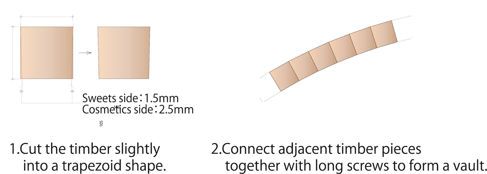 دو خرک چوبی که هر دو از ریشه های این برند – ساخته شده اند در این مجموعه استفاده شده است. قطعات چوب هینوکی 105mm x 105mm کمی تراشیده شده اند تا اشکال ذوزنقه ای ایجاد کنند که سپس با پیچ های بلند در کنار یکدیگر ثابت می شوند تا یک طاق بزرگ و کمانی ایجاد شود. این طاق ها به عنوان تیرهایی در نظر گرفته می شوند که توسط ستون های فولادی ظریف و دیوارهای پشتی پشتیبانی می شوند.