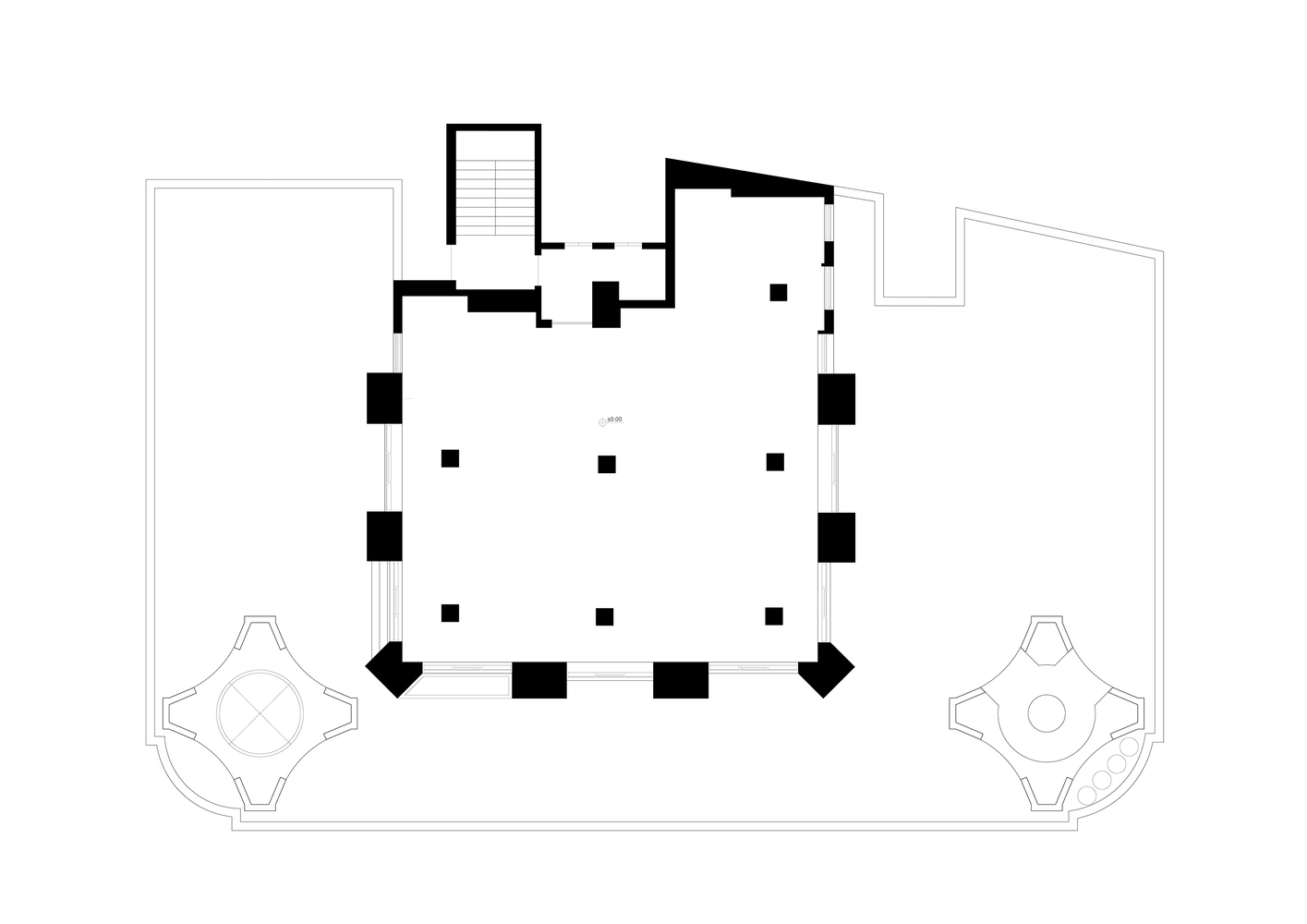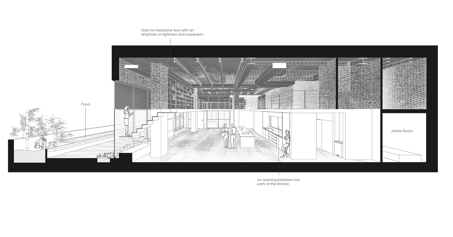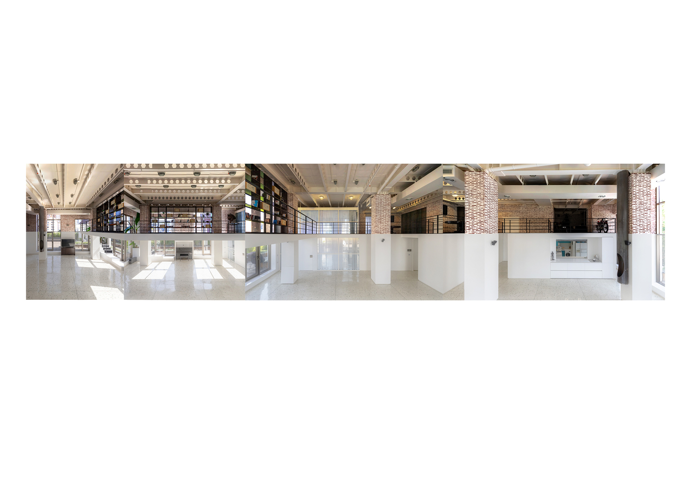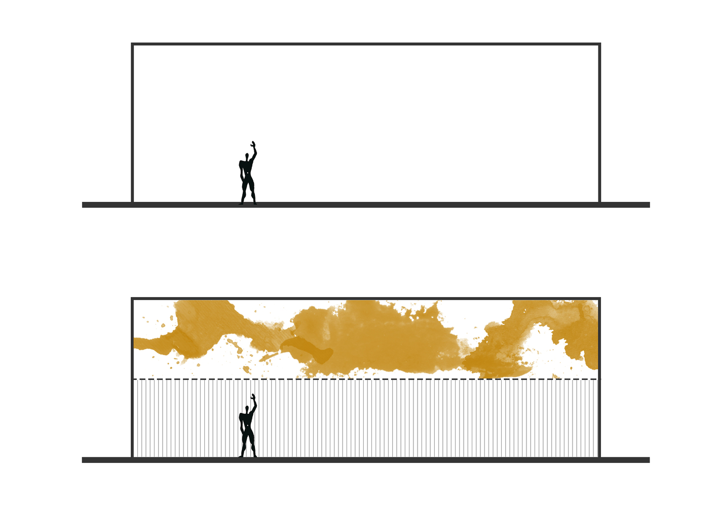 با ویژگی های خاص آن به عنوان یک فضای یکپارچه – تعریف یک خط سطح فرضی/تخیلی (مقطع) است که با ارتفاع استاندارد یک فضای مسکونی تعیین می شود تا نواحی بالا و پایین را برگرداند. از این خط به یک “دوگانگی”. هر آنچه که یک خانه به عنوان وسیله ای برای زندگی با استانداردهای تعریف شده و مطابق با ایده های فضاهای مسکونی نیاز دارد، زیر این خط تراز خیالی طراحی می شود. منطقه پایین، تحقق فضای زندگی است که به نیازهای عملکردی پاسخ می دهد، در حالی که در عین حال، مفاهیم متعارف یک فضای زندگی را به چالش می کشد: یک فضای روشن، شفاف با بافتی نرم، ساده و سفید. اما در بالای خط، فضایی شناور و غریب با حس یک پلان نامشخص و منعطف در ارتفاعی کمتر، نه چندان روشن، با ظاهری خشن و آشکار شکل گرفته است.
