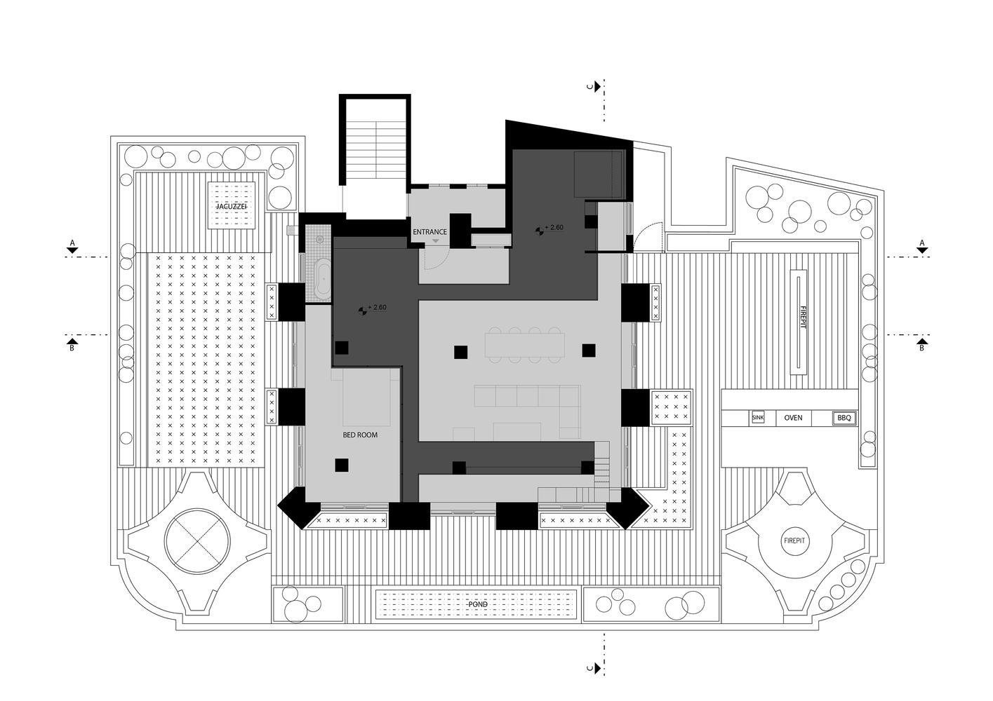 طبقه همکف این پروژه شامل فضاهایی مانند اتاق نشیمن و غذاخوری، اتاق خواب مستر، آشپزخانه و اتاق خدمتکار می باشد. تراس در این طبقه از دو قسمت تشکیل شده است: بخش اول با فضاهای عمومی در تعامل است و آتشدان، باربیکیو و محل تجمع را در خود جای داده است. در حالی که قسمت دوم به فضاهای خصوصی می پردازد که زمین بازی و جکوزی را در خود جای داده است. در نیم طبقه، فضاهای انعطاف پذیری مانند اتاق بازی، کتابخانه، اتاق نشیمن و اتاق مهمان وجود دارد. که با تغییر کاربری سازگار هستند و می توانند بر اساس نیاز کاربران تغییر کنند.