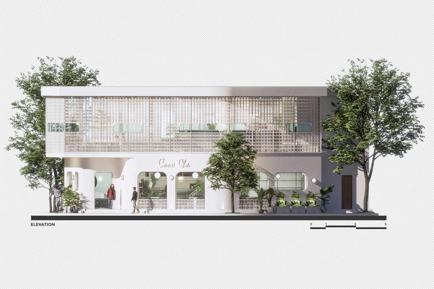 این پروژه در منطقه شهری جدید شهر Phan Rang، درست در گوشه جاده اصلی است و تقریباً نور مستقیم خورشید را از غرب دریافت می کند. بنابراین، استودیو PT Arch برای اطمینان از نور گرفتن و همچنین دید مستقیم از بیرون، اما همچنان باید از گرمای خورشید جلوگیری کند، استودیو PT Arch تصمیم گرفت فضایی را طراحی کند که هم توپر و هم توخالی باشد. این کانسپت همچنین باید مدرن و جوان پسند و هماهنگ با تمام سنین باشد و مناسب برای موقعیت مکانی یک منطقه تفریحی در منطقه شلوغ شهر Phan Rang باشد.