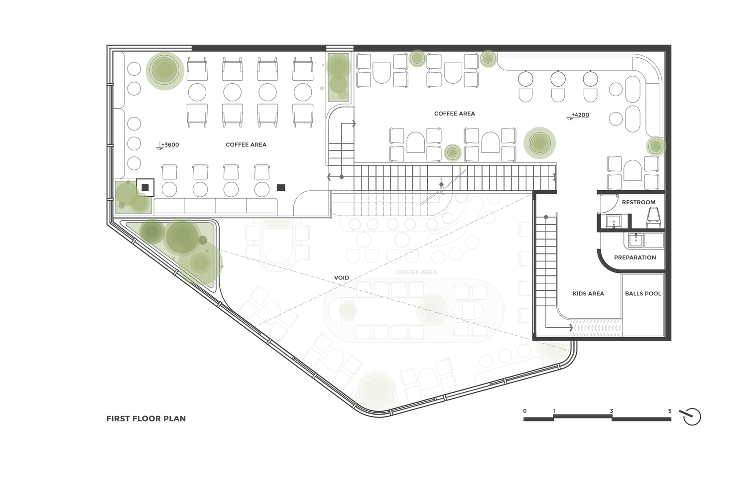 پله همچنان از وضعیت موجود برای به حداقل رساندن هزینه ها استفاده می کند که این نیز عامل جالبی برای PT Arch Studio برای حل مشکل طراحی است. از آنجایی که پله در ۲ جهت مختلف به ۲ تقاطع تقسیم می شود، منطقه دسترسی به ۲ فضای مجزا تقسیم می شود، یکی به سمت قسمت قهوه خانه طبقه بالا و دیگری به سمت فضای بازی کودکان.
