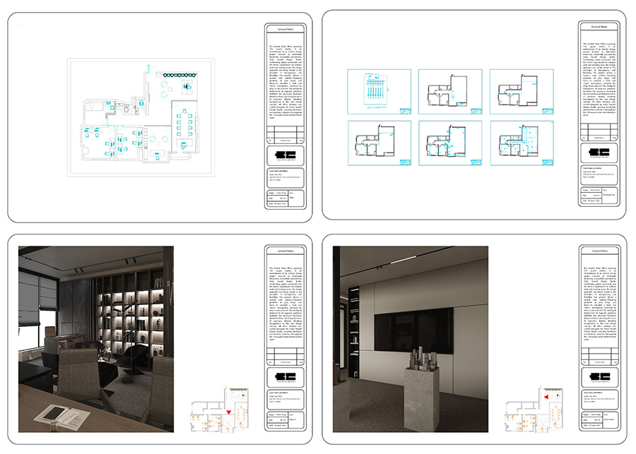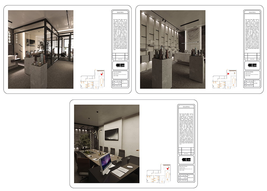 با توجه به محدودیت فضایی و نیاز کارفرما به ایجاد همزمان چندین فضای کاری متمرکز و اتاق جلسات، رویکرد طراحی بر دو اصل شفافیت و انعطاف‌پذیری متمرکز شد. این پروژه از یک پالت رنگی خنثی – شامل طیف‌هایی از خاکستری، بژ و مشکی – برای ایجاد فضایی تازه، آرام و “تمیز” استفاده می‌کند که با کنتراست‌های بصری قوی، غنی شده است. این پس‌زمینه خنثی، به عنوان یک بوم آرام، تمرکز را بر روی کار و فعالیت‌های اداری قرار می‌دهد.