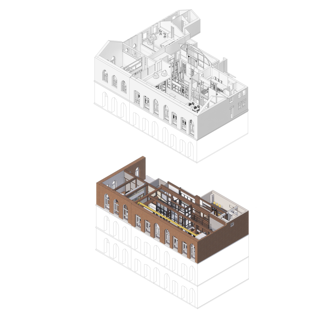 این فضا، بخشی از یک ساختار میراثی، با پنجره های تخته شده، ستون های چوبی مقاوم سازی شده با مهاربندی های فلزی، و دیوارهای آجری غیر باربر که مناطق را از یکدیگر محصور کرده و جدا می کند، به دست آمده است. بنابراین، نیاز به یک پاسخ انتقادی به فضای به ارث رسیده، بازتاب صادقانه از زمینه، و یک نظم طراحی کاربردی عملگرایانه برای فضای مورد نظر صادق است.