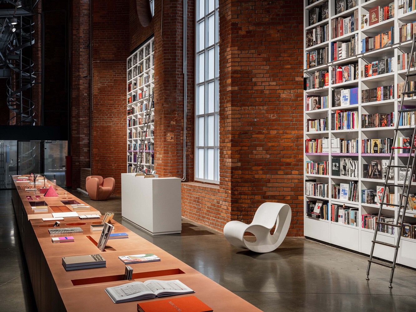 قفسه های بلند ۵ متری در دروازه های گاراژ تصویر یک کتابخانه کلاسیک را بازسازی می کنند، با هندسه دقیق قاب پنجره ها و آجرکاری هماهنگ هستند و به طور واضح عملکرد فضا را نشان می دهند – به محض ورود بازدیدکنندگان به موزه، بلافاصله، بدون هیچ راهنمایی ناوبری، ببینید کتابفروشی در کجا واقع شده است.