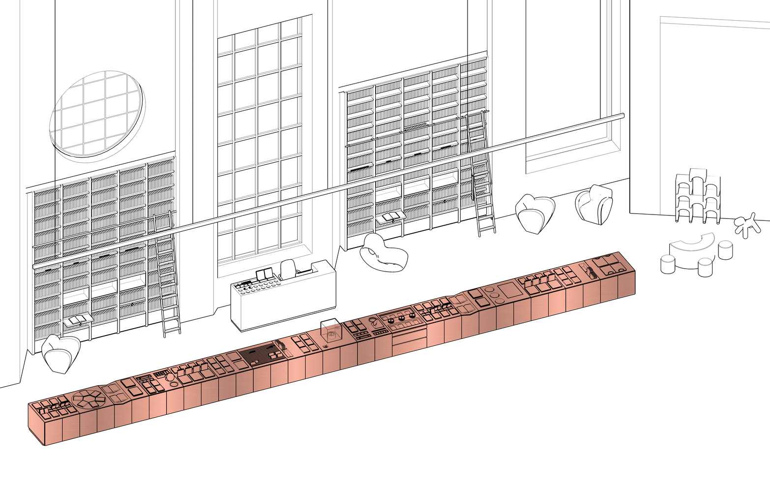 یک پیشخوان مسی ۱۸ متری در مرکز داخلی قرار دارد. این ماده زیبایی بصری را غنی می کند و به خوبی با آجر و بتن صنعتی ترکیب می شود. پیشخوان به طور یکپارچه فروشگاه را از نمایشگاه جدا می کند، فضایی را برای نمایش کامل کتاب ها و نه از پشت آنها فراهم می کند، و حجم زیادی برای ذخیره سازی در داخل دارد.