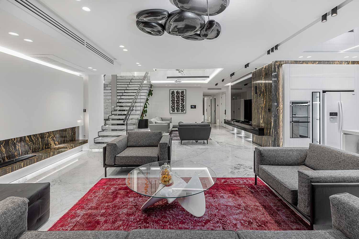 در طراحی جدید، پله خطی به کار گرفته شده است تا علاوه بر بزرگ تر شدن نشیمن همکف، ویدی بزرگ ارتباط میان دو طبقه را هر چه بهتر برقرار نماید. همچنین با به کارگیری آینه در جداره پله و وید گویی فضای نشیمن دو برابر شده و ارتباط بصری میان فضاهای عمومی دو طبقه نیز گسترش یافته است.