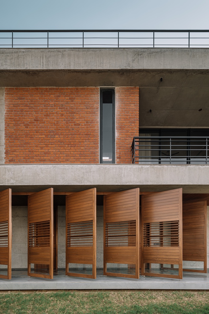 آستانه های پویا: درهای چوبی تمام قد و درهای محوری بزرگ کرکره ای به عنوان پوسته ای قابل تنفس در امتداد راهروهای اصلی عمل می کنند. در حالت بسته، کرکره ها نور را فیلتر کرده و تهویه متقابل را تسهیل می کنند؛ در حالت باز، فضای داخلی را به صورت فیزیکی با باغ ادغام می کنند.