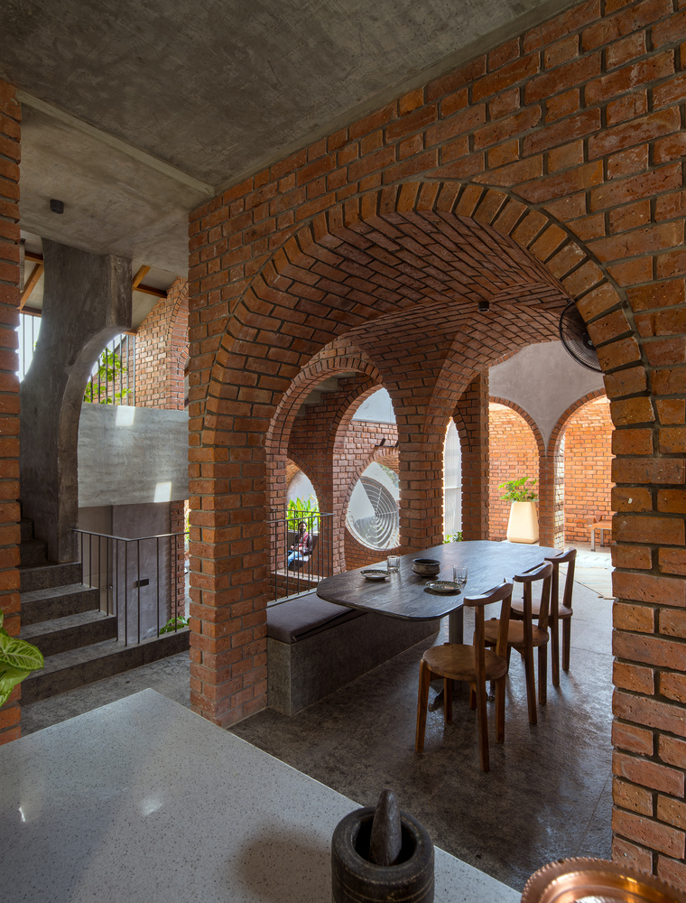 بلوک Lشکل با دیوارهای آجری نمایان و سقفی کمشیب که تقریباً به زمین میرسد، یادآور این حساسیتهای سنتی است. این بلوک آجرین با آجرهای محلی ساخته شده و ارزشهای بومی را به شیوهای معاصر بازتفسیر میکند. در مقابل، حجم مکعبی بتنی به معماری دوران استعمار و پس از آن اشاره دارد؛ دیوارهای ۲۰۰ میلیمتری بتننما سنگ را بهعنوان بتن ریخته تعریف میکنند و با سطوح لایهلایه و جابجاییهای ظریف، هویتی ایندو-بروتالیزم خلق میکنند. بخش بتنی با یک تراس کوچک پوشیده از گیاه با فضایی آرام در ترکیب خود پایان مییابد.