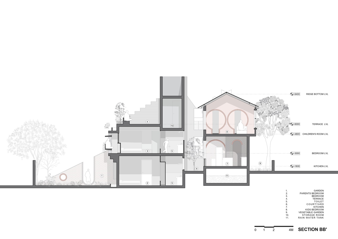 برای ایجاد پیوستگی فضایی و هویت منسجم، عملکردهای کلیدی مانند نشیمن، آشپزخانه و ناهارخوری، فضای خانوادگی و مطالعه در سطوح مختلف قرار گرفته اند. این فضاها به سمت داخل جهتگیری دارند و ارتباطهای بصری لایهلایهای را در امتداد پله مرکزی ایجاد میکنند.