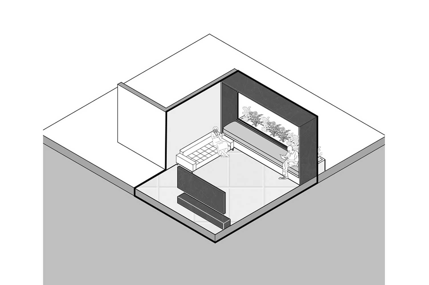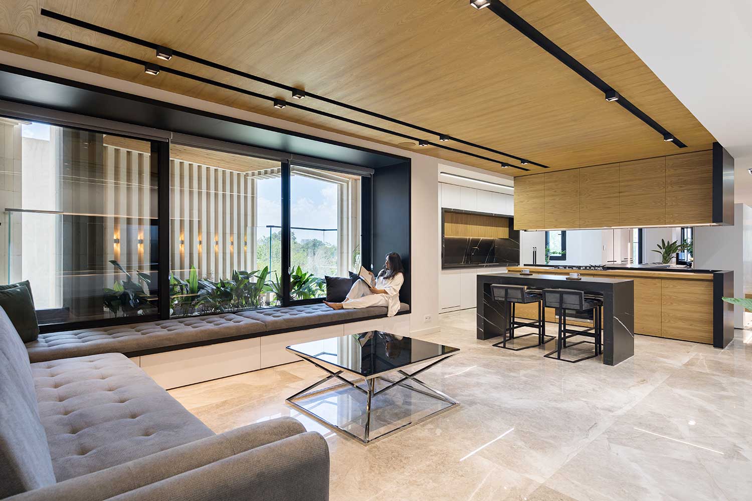 فضاهای دنج نشستن در کنار پنجرههای شیشهای با دید به سبزینگی تراس ها، محیطی برای استراحت، حس آرامش برای ساکنین خانه به وجود آورده، این قسمت ها به صورت حجم تو خالی طراحی شده است.