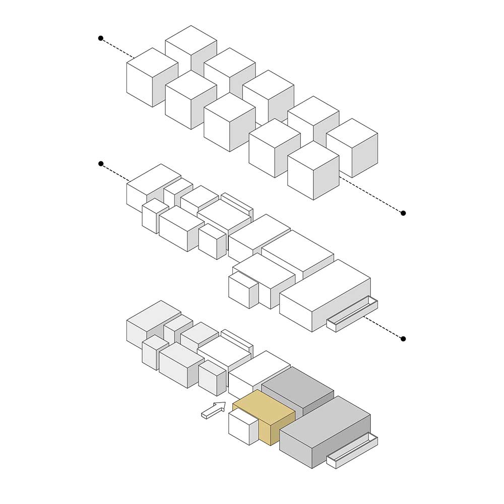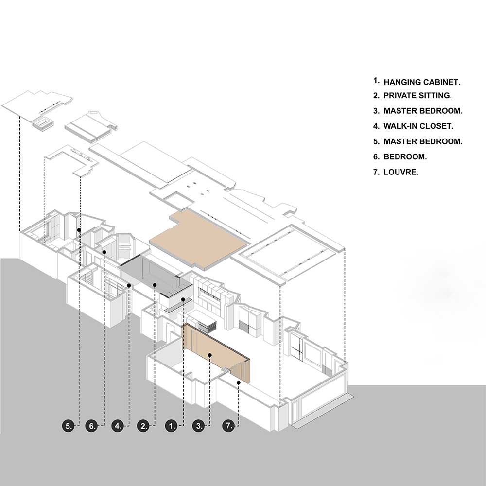 با خالی کردن داخل حجم، کاربری فضا به اتاق اختصاص یافت و یک وجه حجم با لوورهای چوبی پوشیده شد که برای اتاق درون خود قابلیت انعطاف پذیری به وجود آورده است. با حرکت لوورها، نماهای مختلف از داخل و خارج و بهره گیری های متفاوت از نور و دید ایجاد شده است. این حجم مکعب مستطیل ساده که شاخصه و ویژگی اصلی و به یادماندنی این پروژه شده است.