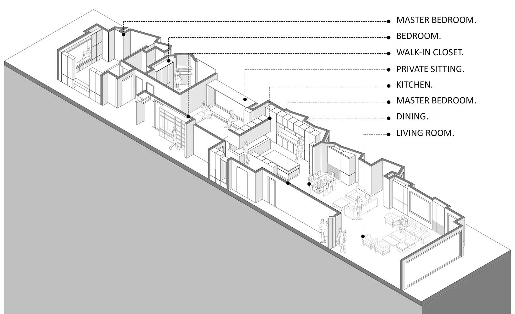 همچنین دید به نشیمن از آشپزخانه حفظ شده و با امتداد پوسته چوبی از کابینت به سقف نشیمن، پیوستگی بصری و هارمونی بین آشپزخانه دوم و نشیمن خصوصی ایجاد شده است. این کابینت با پوسته ای مشکی و چوب در درون خود، به عنوان نقش جدا کننده نیمه شفاف با هویتی مستقل (و نه صرفا جدا کننده) عمل کرده است.